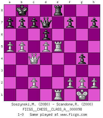 Last move : 1-0 2011 October 27 12:54:21 [Event "FICGS__CHESS__CLASS_A__000098"] [Site "FICGS"] [Date "2011.07.12"] [Round "1"] [White "Soszynski,Marek"] [Black "Scandone,Raffaele"] [Result "1-0"] [WhiteElo "2080"] [BlackElo "2000"] 1.e4 e5 2.d4 exd4 3.Qxd4 Nc6 4.Qe3 g6 5.Nf3 Bg7 6.Bc4 d6 7.O-O Nge7 8.Bd2 Be6 9.Bc3 Bxc4 10.Bxg7 Rg8 11.Re1 Rxg7 12.Qc3 Rg8 13.Qxc4 g5 14.Nc3 g4 15.Nd4 Qd7 16.Nxc6 Nxc6 17.Nd5 Rg6 18.b4 O-O-O 19.b5 Ne7 20.a4 Nxd5 21.exd5 Rg5 22.a5 Kb8 23.Re4 Re8 24.Rae1 Rge5 25.Rxe5 1-0 Centre game : Paulsen attack Kingside Castling by player White (move 7) Queenside Castling by player Black (move 18) Player White won this chess game. Follow this game move after move (download)A Chess game is a dialogue, a conversation between a player and his opponent. Each move by the opponent may contain threats or be a blunder, but a player cannot defend against threats or take advantage of blunders if he does not first ask himself: What is my opponent planning after each move ? (Bruce A. Moon) Meine Liebe ist Schach, Schach, Schach. Ich muss jeden Tag Schach spielen, deshalb fühle ich mich so stark. (Miguel Najdorf) Yo creo que el Ajedrez posee una magia que es también una ayuda en la edad avanzada. Una rodilla reumática es olvidada durante una partida de Ajedrez y otros eventos pueden parecer algo sin importancia comparada a una catástrofe en el tablero de Ajedrez. (Vlastimil Hort) Votre prénom est 'Tactique', votre deuxième prénom est 'Tactique' et votre nom est 'Tactique'. (Ken Smith) God, you are such an idiot. - Actually, I thought I was more of a jerk. (Gregory House to Stacy Warner, House M.D.)