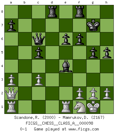 Last move : 0-1 2011 October 27 12:54:21 [Event "FICGS__CHESS__CLASS_A__000098"] [Site "FICGS"] [Date "2011.07.12"] [Round "1"] [White "Scandone,Raffaele"] [Black "Mamrukov,Dmitri"] [Result "0-1"] [WhiteElo "2000"] [BlackElo "2167"] 1.Nf3 Nf6 2.c4 b6 3.Nc3 Bb7 4.d4 e6 5.a3 d5 6.cxd5 Nxd5 7.e3 g6 8.Bb5+ c6 9.Ba4 Bg7 10.O-O O-O 11.e4 Nxc3 12.bxc3 c5 13.Bg5 Qd6 14.Re1 Nc6 15.Bxc6 Qxc6 16.Ne5 Qe8 17.Ng4 f6 18.Bh6 Bxh6 19.Nxh6+ Kg7 20.Qd2 g5 21.Ng4 h5 22.Ne3 Bxe4 23.dxc5 Rd8 24.Qa2 bxc5 25.Nf1 Qc6 0-1 Reti Opening Kingside Castling by player White (move 10) Kingside Castling by player Black (move 10) Player Black won this chess game. Follow this game move after move (download)A player surprised is half beaten. (Proverb) Im Schach gibt es keinen Platz für Galanterie. (Irving Chernev) El poder defensivo de una pieza clavada, solamente es imaginario. (Aaron Nimzovich) Aucun coup ne doit être joué sans but. (Pedro Damiano) Some people are so afraid to die that they never begin to live. (Henry Van Dyke)