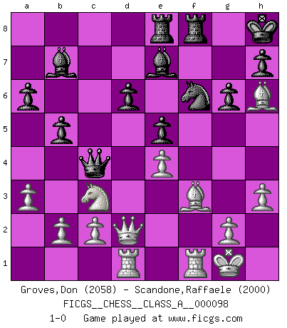 Last move : 1-0 2011 October 27 12:55:13 [Event "FICGS__CHESS__CLASS_A__000098"] [Site "FICGS"] [Date "2011.07.12"] [Round "1"] [White "Groves,Don"] [Black "Scandone,Raffaele"] [Result "1-0"] [WhiteElo "2058"] [BlackElo "2000"] 1.e4 c5 2.Nf3 d6 3.d4 cxd4 4.Nxd4 Nf6 5.Nc3 a6 6.Be2 e6 7.O-O Qc7 8.f4 Be7 9.Qe1 O-O 10.Qg3 Nc6 11.Be3 Nxd4 12.Bxd4 b5 13.a3 Bb7 14.Bf3 Rad8 15.Rad1 g6 16.f5 e5 17.Be3 Kh8 18.Qf2 Qc8 19.fxg6 fxg6 20.Qd2 Ng4 21.Bb6 Rde8 22.h3 Nf6 23.Be3 Qc4 24.Bh6 1-0 Sicilian : Najdorf, Opovcensky variation Kingside Castling by player White (move 7) Kingside Castling by player Black (move 9) Player White won this chess game. Follow this game move after move (download)Adequate compensation for a sacrifice is having a sound combination leading to a winning position; adequate compensation for a blunder is having your opponent snatch defeat from the jaws of victory. (Bruce A. Moon) Es ist schade, dass viele Schachsportler vergessen, wie wichtig Auftreten und angemessene Kleidung sind. (Alexandra Kosteniuk) Los errores estan ahí, esperando a que se cometan. (Savielly Tartakower) Vous n'êtes pas toujours obligé de jouer le meilleur coup. Un coup doit être actif, entreprenant, correct et beau ! (David Bronstein) All war is based on deception. (Sun Tzu)
