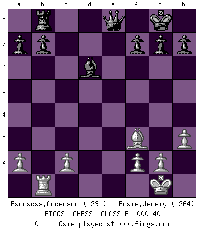 Last move : 0-1 2011 August 15 19:14:17 [Event "FICGS__CHESS__CLASS_E__000140"] [Site "FICGS"] [Date "2011.07.13"] [Round "1"] [White "Barradas,Anderson"] [Black "Frame,Jeremy"] [Result "0-1"] [WhiteElo "1291"] [BlackElo "1264"] 1.e4 e5 2.Nf3 Nf6 3.Nxe5 d6 4.Nf3 Nxe4 5.d4 Be7 6.Bd3 Nf6 7.O-O Bg4 8.Be2 Nbd7 9.Nc3 c6 10.d5 O-O 11.h3 Bxf3 12.Bxf3 cxd5 13.Nxd5 Nxd5 14.Qxd5 Rb8 15.Re1 Nb6 16.Qa5 Re8 17.Qc3 Bf6 18.Rxe8+ Qxe8 19.Qd2 Nc4 20.Qd1 Nxb2 21.Bxb2 Bxb2 22.Rb1 Ba3 23.Qxd6 Bxd6 0-1 Petrov : Classical attack Kingside Castling by player White (move 7) Kingside Castling by player Black (move 10) Player Black won this chess game. Follow this game move after move (download)The game of Chess is not merely an idle amusement; several very valuable qualities of the mind are to be acquired and strengthened by it, so as to become habits ready on all occasions; for life is a kind of Chess. (Benjamin Franklin) Jeder Schachmeister war einmal ein Anfänger. (Irving Chernev) Una buena memoria, concentración, imaginación y una fuerte voluntad, se requiere para llegar a ser un buen jugador. (Bobby Fischer) Psychologiquement, tu dois avoir confiance en toi même, mais cette confiance doit être basée sur des faits. (Robert Fischer) You have to believe in yourself. (Sun Tzu)