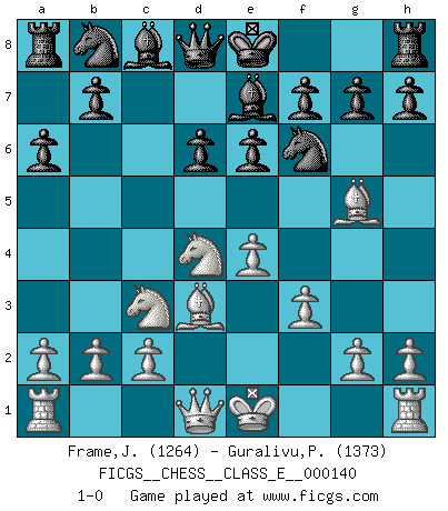 Last move : 1-0 2011 September 15 10:20:23 [Event "FICGS__CHESS__CLASS_E__000140"] [Site "FICGS"] [Date "2011.07.13"] [Round "1"] [White "Frame,Jeremy"] [Black "Guralivu,Paul-Iosif"] [Result "1-0"] [WhiteElo "1264"] [BlackElo "1373"] 1.e4 c5 2.Nf3 d6 3.d4 cxd4 4.Nxd4 Nf6 5.Nc3 a6 6.Bg5 e6 7.Bd3 Be7 8.f3 1-0 This chess game has been lost on time (started : 2011.07.13 19:17:46) Sicilian : Najdorf, 6...e6 Player White won this chess game. Follow this game move after move (download)A man without frontiers. He didn't divide the East and the West, he brought them together in their admiration for him. (Ljubomir Ljubojevic, about Bobby Fischer's death) Warum muß ich gegen diesen IDIOTEN verlieren? (Aaron Nimzowitsch) El Ajedrez moderno está demasiado preocupado con cosas como la estructura de Peones. Olvidenlo, el Jaque Mate termina la partida. (Nigel Short) Les échecs, c'est l'imagination. (David Bronstein) To err is human, to shift the blame on someone else is tactical. (Mladen Jankovic)