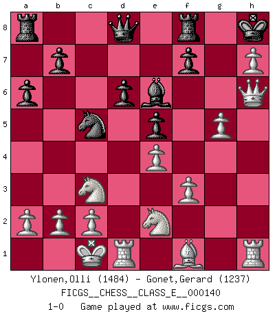 Last move : 1-0 2011 October 23 15:57:16 [Event "FICGS__CHESS__CLASS_E__000140"] [Site "FICGS"] [Date "2011.07.13"] [Round "1"] [White "Ylonen,Olli"] [Black "Gonet,Gerard"] [Result "1-0"] [WhiteElo "1484"] [BlackElo "1237"] 1.d4 Nf6 2.Bg5 Ne4 3.Bf4 c6 4.f3 Nf6 5.e4 d6 6.Qd2 g6 7.Nc3 Bg7 8.Bh6 O-O 9.O-O-O Nbd7 10.h4 e5 11.Bxg7 Kxg7 12.g4 c5 13.dxc5 Nxc5 14.h5 Be6 15.hxg6 Ng8 16.gxh7 Nh6 17.Qxh6+ Kh8 18.g5 a6 19.Nge2 1-0 Trompowsky attack (Ruth, Opovcensky Opening) Kingside Castling by player Black (move 8) Queenside Castling by player White (move 9) Player White won this chess game. Follow this game move after move (download)Look at Garry Kasparov. After he loses, invariably he wins the next game. He just kills the next guy. That's something that we have to learn to be able to do. (Maurice Ashley) Du weisst es gibt ein Problem mit Computern und Fernschach, wenn jeder eine Rating von 2450 hat. (John Christen Knudsen) El Ajedrez es tan interesante por sí solo, que no es necesario un interés monetario para persuadir a una persona a que lo practique; por lo tanto, nunca se juega por dinero. (Benjamin Franklin) Des combinaisons [dans le jeu d'échecs] pareilles à des mélodies. Je crois entendre pour ainsi dire la musique des coups... (Vladimir Nabokov) The arrogant army will lose certainly the battle. (Chinese proverb)
