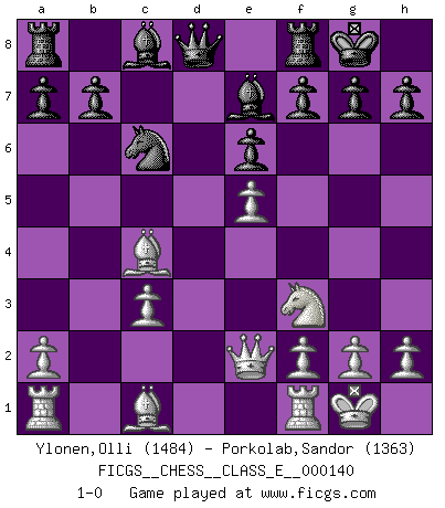 Last move : 1-0 2011 November 7 12:38:9 [Event "FICGS__CHESS__CLASS_E__000140"] [Site "FICGS"] [Date "2011.07.13"] [Round "1"] [White "Ylonen,Olli"] [Black "Porkolab,Sandor"] [Result "1-0"] [WhiteElo "1484"] [BlackElo "1363"] 1.e4 c5 2.c3 e6 3.Nf3 Nf6 4.e5 Nd5 5.d4 cxd4 6.cxd4 d6 7.Bc4 Nc6 8.O-O Be7 9.Qe2 O-O 10.Nc3 Nxc3 11.bxc3 dxe5 12.dxe5 1-0 This chess game has been lost on time (started : 2011.07.13 19:17:46) Sicilian : Alapin's variation (2.c3) Kingside Castling by player White (move 8) Kingside Castling by player Black (move 9) Player White won this chess game. Follow this game move after move (download)Excellence at Chess is one mark of a scheming mind. (Sir Arthur Conan Doyle) Im Internet Chess Club betrug mein Rating vorübergehend 3350 ELO-Punkte. (Sergej Karjakin) El Ajedrez expande y enriquece tu mente. (Saudin Robovic) Avec des compensations pour le matériel en plus... (Anonyme) To be champion requires more than simply being a strong player; one has to be a strong human being as well. (Anatoly Karpov)