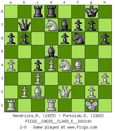 Last move : 1-0 2011 December 1 14:51:12 [Event "FICGS__CHESS__CLASS_E__000140"] [Site "FICGS"] [Date "2011.07.13"] [Round "1"] [White "Hendricks,Richard"] [Black "Porkolab,Sandor"] [Result "1-0"] [WhiteElo "1329"] [BlackElo "1363"] 1.d4 Nf6 2.Nf3 e6 3.Bf4 b6 4.e3 Bb7 5.Bd3 d6 6.O-O Nbd7 7.Nbd2 Be7 8.e4 O-O 9.Qe2 c5 10.c3 Qc7 11.h3 h6 12.a4 Rac8 13.Bh2 Rfd8 14.e5 Ne8 15.Ne4 c4 16.Bc2 Bd5 17.Rfd1 dxe5 18.Nxe5 Qb7 19.f3 a6 20.Bf4 Nef6 21.Nxd7 1-0 This chess game has been lost on time (started : 2011.07.13 19:17:46) Queen's pawn game Kingside Castling by player White (move 6) Kingside Castling by player Black (move 8) Player White won this chess game. Follow this game move after move (download)Chess, like any creative activity, can exist only through the combined efforts of those who have creative talent, and those who have the ability to organize their creative work. (Mikhail Botvinnik) Wir irren allesamt, nur jeder irrt anders. (Georg Christoph Lichtenberg) La captura del Rey enemigo es la finalidad pero no el primer objetivo de la partida. (William Steinitz) Les échecs, c'est la lutte contre l'erreur. (Johannes Zukertort) Life is like internet, nothing interesting, but noone want to leave it. (Ilmars Cirulis)