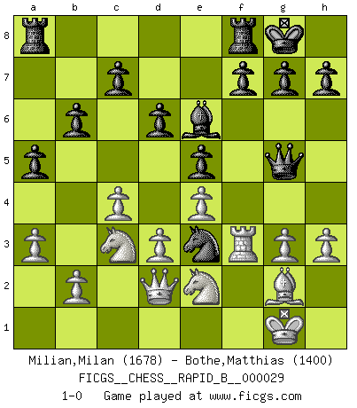 Last move : 1-0 2007 February 19 19:29:16 [Event "FICGS__CHESS__RAPID_B__000029"] [Site "FICGS"] [Date "2006.12.26"] [Round "1"] [White "Milian,Milan"] [Black "Bothe,Matthias"] [Result "1-0"] [WhiteElo "1678"] [BlackElo "1400"] 1.c4 e5 2.Nc3 Nc6 3.g3 Bc5 4.Bg2 Nf6 5.e4 O-O 6.d3 d6 7.Nge2 b6 8.O-O Be6 9.a3 a5 10.Be3 Bxe3 11.fxe3 Ng4 12.Rf3 Qg5 13.h3 Nxe3 14.Qd2 Nd4 15.Raf1 Nxf3+ 16.Rxf3 1-0 English : Sicilian Reversed Kingside Castling by player Black (move 5) Kingside Castling by player White (move 8) Player White won this chess game. Follow this game move after move (download)If you aren't afraid of Spassky, then I have removed the element of money. (Jim Slater) Wenn Du einsam bist, wenn Du Dich in der Welt wie ein Fremder fühlst, spiele Schach. Das wird Deinen Geist erheben und Dein Ratgeber im Kampf sein. (Aristoteles) La enorme capacidad mental, en la que sin ella no puede un jugador de Ajedrez existir, es demasiado requerida por el Ajedrez al grado de que nunca podrá liberar su mente de este juego. (Albert Einstein) Les échecs sont plus proches de l'art de l'assassinat que de l'art de la guerre. (Arturo Perez-Reverte) A mistake is only a mistake if you let it happen twice. Otherwise it is a learning experience. (Daniel Parmet)