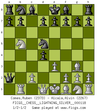 Last move : 1/2-1/2 2011 July 14 1:56:35 [Event "FICGS__CHESS__LIGHTNING_SILVER__000118"] [Site "FICGS"] [Date "2011.07.14"] [Round "1"] [White "Comes,Ruben"] [Black "Alcala,Alvin"] [Result "1/2-1/2"] [WhiteElo "2373"] [BlackElo "2267"] 1.d4 Nf6 2.Bf4 c5 3.e3 Qb6 4.Nc3 Qxb2 5.Nb5 Nd5 6.Rb1 Qxa2 7.Bg3 cxd4 8.Ra1 Qb2 9.Rb1 Qa2 10.Ra1 Qb2 11.Rb1 Qa2 1/2-1/2 Queen's pawn game This chess game ended in a draw. Follow this game move after move (download)Chess is a sea in which a gnat may drink and an elephant may bathe. (Hindu proverb) Lisa Lane, amerikanische Schachmeisterin, hatte Fischer einmal als stärksten lebenden Spieler bezeichnet. Antwort: Das ist richtig, aber Lisa Lane ist eigentlich nicht in der Lage, das zu beurteilen. (Robert James Fischer) Muchos jugadores de Ajedrez se sorprendían cuando después de la partida, Fischer explicaba con calma: 'Yo ya había analizado esta posibilidad' en una posición en la cual yo creía que no era posible de prever desde la apertura. (Mikhail Tal) Psychologiquement, tu dois avoir confiance en toi même, mais cette confiance doit être basée sur des faits. (Robert Fischer) Over-the-board chess is the favorite of mortals, correspondence chess is the favorite of the gods. (Eduard Dyckhoff)