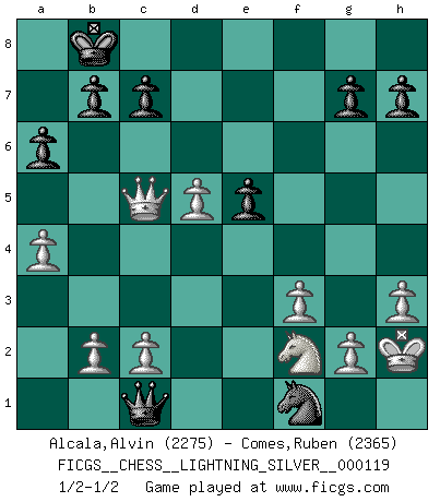 Last move : 1/2-1/2 2011 July 14 2:32:9 [Event "FICGS__CHESS__LIGHTNING_SILVER__000119"] [Site "FICGS"] [Date "2011.07.14"] [Round "1"] [White "Alcala,Alvin"] [Black "Comes,Ruben"] [Result "1/2-1/2"] [WhiteElo "2275"] [BlackElo "2365"] 1.e4 e5 2.Nf3 Nc6 3.Bb5 f5 4.d3 fxe4 5.dxe4 Nf6 6.O-O Bc5 7.Qd3 d6 8.Qc4 Bd7 9.Nc3 Qe7 10.Nd5 Nxd5 11.exd5 Nd4 12.Bxd7+ Qxd7 13.Nxe5 Qf5 14.Nd3 O-O-O 15.a4 Rhe8 16.Kh1 a6 17.f3 Ba7 18.Bf4 Kb8 19.Rae1 Qh5 20.Bd2 Rxe1 21.Bxe1 Re8 22.Bf2 Nf5 23.Nf4 Qh6 24.Re1 Be3 25.h3 Re5 26.Nd3 Bxf2 27.Rxe5 dxe5 28.Nxf2 Qc1+ 29.Kh2 Ne3 30.Qc5 Nf1+ 1/2-1/2 Ruy Lopez : Schliemann defense Kingside Castling by player White (move 6) Queenside Castling by player Black (move 14) This chess game ended in a draw. Follow this game move after move (download)We don't really know how the game was invented, though there are suspicions. As soon as we discover the culprits, we'll let you know. (Bruce Pandolfini) Ich brauche nur einen Blick auf das Schachbrett zu werfen, und weiß schon, was in der Stellung steckt, was geschehen kann und was geschehen wird. Alle übrigen suchen und prüfen, ich aber weiß es! (José Raúl Capablanca) Una partida de Ajedrez se divide en 3 etapas: la primera cuando piensas que tienes la ventaja, la segunda cuando crees que tienes la ventaja y la tercera... ¡cuando te das cuenta que vas a perder!. (Savielly Tartakower) Botvinnik disait en comparant les échecs à la musique: Il existe une science dont le but est l'étude de l'acoustique et des sons. Mais il y a aussi un art qui se sert de l'océan des sons : c'est la musique. De toute évidence, il en est de même pour la pensée. La logique est l'étude des lois de la réflexion et les échecs reflètent, en tant qu'art, le côté logique de la réflexion, sous la forme d'images artistiques... Extrait de Fischer - Spassky, Reykjavik 1972 par Alexander & F. Wyndham (Ed. Solar), p 37. The hypothalamus is one of the most important parts of the brain, involved in many kinds of motivation, among other functions. The hypothalamus controls the 'Four Fs: Fighting, Fleeing, Feeding and Mating. (Unknown author)