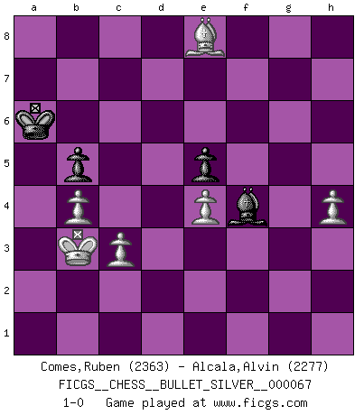 Last move : 1-0 2011 July 14 3:39:54 [Event "FICGS__CHESS__BULLET_SILVER__000067"] [Site "FICGS"] [Date "2011.07.14"] [Round "1"] [White "Comes,Ruben"] [Black "Alcala,Alvin"] [Result "1-0"] [WhiteElo "2363"] [BlackElo "2277"] 1.e4 c5 2.Nf3 d6 3.d4 cxd4 4.Nxd4 Nf6 5.Nc3 a6 6.Bg5 Nbd7 7.f4 e6 8.Qe2 Qc7 9.O-O-O b5 10.a3 Bb7 11.g4 Be7 12.Kb1 h6 13.Bh4 Rc8 14.Rg1 g5 15.fxg5 Nh7 16.g6 Bxh4 17.gxf7+ Kxf7 18.g5 hxg5 19.Qh5+ Ke7 20.Qg6 Rcg8 21.Qxe6+ Kd8 22.Nd5 Bxd5 23.Qxd5 Nhf8 24.Bh3 g4 25.Bxg4 Nb6 26.Nc6+ Ke8 27.Bh5+ Kd7 28.Ne5+ Kc8 29.Rxg8 Nxd5 30.Rxh8 Qg7 31.Ng6 Be7 32.Rxd5 Kd7 33.Rxf8 Bxf8 34.Rf5 Be7 35.Rf7 Qxf7 36.Ne5+ dxe5 37.Bxf7 Kc7 38.c3 Kb6 39.Kc2 a5 40.b4 Ka6 41.Be8 Bg5 42.Kb3 Bf4 43.h4 axb4 44.axb4 1-0 Sicilian : Najdorf, 6.Bg5 Queenside Castling by player White (move 9) 10 pieces endgame at move 44 : White KBPPPP , Black KBPP WHITE : King + 1 Bishop 4 Pawns BLACK : King + 1 Bishop 2 Pawns Player White won this chess game. Follow this game move after move (download)Chess books should be used as we use glasses: to assist the sight, although some players make use of them as if they thought they conferred sight. (Jose Raul Capablanca) Wenn ich gewinne bin ich ein Genie. Wenn nicht, dann bin ich keines. (Robert James Fischer) ¿Porque tengo que perder ante este idiota?. (Aron Nimzovich) La vérité est comme le meilleur coup aux échecs : elle existe, mais il faut la chercher. (Arturo Perez-Reverte) Plans are ideas that never come to fruition. (Daniel Parmet)