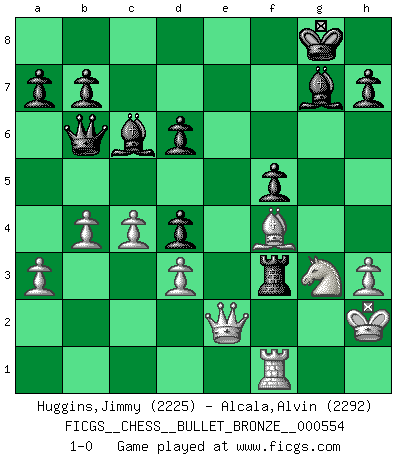 Last move : 1-0 2011 July 14 19:26:51 [Event "FICGS__CHESS__BULLET_BRONZE__000554"] [Site "FICGS"] [Date "2011.07.14"] [Round "1"] [White "Huggins,Jimmy"] [Black "Alcala,Alvin"] [Result "1-0"] [WhiteElo "2225"] [BlackElo "2292"] 1.e4 c5 2.Nc3 d6 3.Nge2 Nf6 4.g3 Nc6 5.Bg2 g6 6.h3 Bg7 7.O-O O-O 8.d3 Rb8 9.a3 Bd7 10.Be3 Ne8 11.f4 Nd4 12.Qd2 e6 13.g4 f5 14.gxf5 exf5 15.Bf2 Nc7 16.Nxd4 cxd4 17.Ne2 Ne6 18.Rae1 Qb6 19.c4 fxe4 20.Bxe4 Rbe8 21.b4 Bc6 22.Kh2 Bh6 23.Bg3 Ng7 24.Qc2 Rf7 25.f5 Nxf5 26.Bxf5 Rxf5 27.Rxf5 gxf5 28.Rf1 Re3 29.Bf4 Bg7 30.Ng3 Rf3 31.Qe2 1-0 Sicilian : Closed Kingside Castling by player White (move 7) Kingside Castling by player Black (move 7) Player White won this chess game. Follow this game move after move (download)The most powerful weapon in Chess is to have the next move. (David Bronstein) Mein Gehirn das ist mein zweitwichtigstes Organ [Aus dem Film: Der Schläfer]. (Woody Allen) La maestría del Ajedrez consiste esencialmente en analizar posiciónes de Ajedrez con precisión. (Mikhail Botvinnik) Aux échecs, l'amour-propre est satisfait quand on remporte la victoire, mais il n'y a pas de honte à être battu. (Benjamin Franklin) The problem with manipulation is that people can turn on you. (Horatio Caine, C.S.I. Miami)