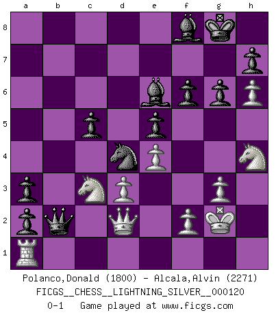 Last move : 0-1 2011 July 15 4:34:20 [Event "FICGS__CHESS__LIGHTNING_SILVER__000120"] [Site "FICGS"] [Date "2011.07.15"] [Round "1"] [White "Polanco,Donald"] [Black "Alcala,Alvin"] [Result "0-1"] [WhiteElo "1800"] [BlackElo "2271"] 1.b3 e5 2.Bb2 Nc6 3.c4 Nf6 4.e3 d5 5.cxd5 Nxd5 6.a3 Bd6 7.b4 O-O 8.Bc4 Nb6 9.Bb3 a5 10.b5 a4 11.Ba2 Na5 12.Ne2 Bf5 13.O-O Nac4 14.Bc3 Bd3 15.Re1 Qe8 16.h3 Qxb5 17.Nc1 Bg6 18.e4 Kh8 19.h4 f6 20.h5 Be8 21.h6 g6 22.Bxc4 Qxc4 23.d3 Qa6 24.Nd2 Kg8 25.Qc2 Bf7 26.Nf3 c5 27.Re2 Nd7 28.Na2 b5 29.Qc1 Rfb8 30.Qd2 Qb6 31.Rc1 Be6 32.Nh2 b4 33.Ba1 Qa6 34.Rd1 Rb6 35.Nf3 Rab8 36.Rb1 bxa3 37.Rxb6 Rxb6 38.Nc3 Bf8 39.Qe3 a2 40.Re1 Rd6 41.Rd1 a3 42.Kh2 Nb8 43.g3 Nc6 44.Kg2 Nd4 45.Rd2 Qb7 46.Nh4 Rb6 47.Rd1 Rb1 48.Qd2 Rxa1 49.Rxa1 Qb2 0-1 Nimzovich-Larsen attack : Modern variation Kingside Castling by player Black (move 7) Kingside Castling by player White (move 13) Player Black won this chess game. Follow this game move after move (download)Chess makes man wiser and clear-sighted. (Vladimir Putin) Smyslow ist ein Beweis dafür, dass ich noch zehn Jahre spielen kann! [der 75 jährige über den 85 jährigen] (Viktor Kortschnoi) El juego de Fischer siempre fue nítido, racional y brillante. Uno de los mejores por siempre. (Dave Regis) Shah mat. Le roi est mort. Cri de fierté d'un joueur venant de terrasser son adversaire, courtoisement, sans effusion de sang. Nowadays, anyone who cannot speak English and is incapable of using the Internet is regarded as backward. (Al-Waleed bin Talal)
