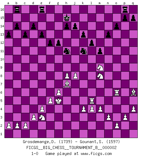 Last move : 1-0 2011 September 11 19:49:19 [Event "FICGS__BIG_CHESS__TOURNAMENT_B__000002"] [Site "FICGS"] [Date "2011.07.15"] [Round "1"] [White "Grosdemange,David"] [Black "Gounant,Stanislas"] [Result "1-0"] [WhiteElo "1739"] [BlackElo "1597"] 1.j2-h4 j15-g14 2.m2-m4 m15-m13 3.b1-c3 l16-o13 4.g1-f3 n15-n14 5.e2-e4 o16-g9 6.p1-o3 e15-e13 7.f1-b5 f16-c13 8.k1-l3 d15-d14 9.l1-p5 p16-o14 10.n2-n3 c16-k9 11.d2-d3 b16-c14 12.f3-e5 g16-f14 13.f2-f4 h16-l13 14.f4-f5 m16-m14 15.o1-k5 m14-k14 16.g2-g4 a16-b16 17.g4-g5 b15-b14 18.h1-m5 k9-j8 19.m5-l4 l13-l4 20.k5-l4 j8-h7 21.l4-h7 o13-h7 22.g5-g6 h7-o13 23.h2-g4 l15-l13 24.c1-g5 l13-l12 25.k2-k4 c14-e15 26.l3-j4 g14-j13 27.j1-h2 h15-g13 28.j4-l5 k16-l14 29.l2-l3 j16-h15 30.j3-j4 q16-l16 31.h2-j3 k14-k9 32.h4-j6 k15-k13 33.e5-f7 g9-j7 34.g4-h6 j7-q14 35.e1-g1 a15-a13 36.h3-h4 f14-h13 37.h6-k7 q14-g5 38.g1-g5 f15-f13 39.o3-n5 f13-f12 40.h4-h5 c13-a11 41.j3-h4 a11-g5 42.h4-g5 k9-k11 43.h5-h6 o13-j8 44.j6-h8 k11-q11 45.h6-h7 j8-m11 46.a1-h1 c15-c13 47.h1-h6 g13-j12 48.h6-p6 m11-p14 49.m1-h1 h13-g11 50.h1-h6 j12-l13 51.q2-q4 l13-k11 52.q1-h1 g15-g13 53.h1-h5 o14-m15 54.l5-m7 e15-g14 55.l3-l4 m15-l13 56.p2-p3 l13-j12 57.j4-j5 l14-k12 58.j5-j6 j12-h10 59.j6-j7 k12-j10 60.c3-d5 j10-h8 61.f7-h8 g11-f9 62.h8-f9 h10-f9 63.b5-f9 l16-p16 64.k7-m8 p14-q13 65.h5-l5 q13-d1 66.d5-e3 d1-m9 67.p6-o6 q11-o11 68.m7-k8 o11-o6 69.h6-o6 o15-o14 70.k8-m9 n14-n13 71.n5-m7 m13-m12 72.h7-h8 g13-g12 73.f9-h7 m12-m11 74.p5-q6 j13-h11 75.m7-l9 k11-l9 76.l5-l9 g14-j13 77.j7-j8 j13-k11 78.l9-l5 1-0 Follow this game move after move (download)Adequate compensation for a sacrifice is having a sound combination leading to a winning position; adequate compensation for a blunder is having your opponent snatch defeat from the jaws of victory. (Bruce A. Moon) Schach ist gnadenlos. Du mußt bereit sein zu töten. (Nigel Short) Cuando tengo las piezas blancas, yo gano porque soy blanco; Cuando tengo las piezas negras, yo gano porque soy Bogolyubov. (Bogolyubov) Les pièces de l'échiquier étaient impitoyables. Elles le retenaient, elles l'absorbaient. Il y avait de l'horreur en cela, mais aussi une harmonie unique. Car, qu'y a-t-il dans le monde, à part les échecs ? (V. Nabokov) Life is the sum of all your choices. (Albert Camus)