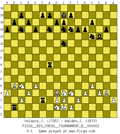 Last move : 0-1 2011 December 6 3:32:47 [Event "FICGS__BIG_CHESS__TOURNAMENT_B__000002"] [Site "FICGS"] [Date "2011.07.15"] [Round "1"] [White "Velasco,Jose Maria"] [Black "Walden,Janeen"] [Result "0-1"] [WhiteElo "1735"] [BlackElo "1873"] 1.j2-k4 j15-k13 2.h1-o7 h15-g13 3.o7-o15 m15-m13 4.o15-o4 e15-e13 5.d2-d4 p16-o14 6.c1-l9 k16-h15 7.e2-e4 l16-p12 8.f1-b5 h16-l13 9.l9-k8 l13-b4 10.b1-c3 b4-b2 11.k8-d2 b2-a3 12.n2-n4 n15-n14 13.o4-j9 a3-h10 14.j9-j7 g16-j15 15.o1-f9 b16-c14 16.e4-e5 f16-b12 17.l2-l3 d15-d14 18.e1-e4 c16-k9 19.e4-h4 h10-j10 20.j7-l5 j10-f7 21.l5-h5 p12-h5 22.k4-h5 f7-f2 23.g1-f3 o16-e7 24.a1-f1 e7-h4 25.f1-f2 h4-f2 26.g2-g3 k9-g6 27.f9-j6 g6-h5 28.j6-h5 f2-g3 29.m2-m4 g3-n9 30.b5-g10 e16-e14 31.l1-p5 q16-o16 32.g10-d13 e14-f14 33.j1-j2 o14-n12 34.p1-o3 n9-m10 35.d2-e1 b12-h6 36.c3-d5 h6-l9 37.p5-o4 o16-o4 38.k1-m2 o4-o8 39.e1-b4 o8-d8 40.d13-h9 k13-j11 41.h9-f7 j15-k13 42.m1-b1 c14-d16 43.b4-e7 d8-c8 44.c2-c3 b15-b14 45.f7-e6 c8-h8 46.h5-g4 d16-e14 47.d5-f6 a16-e16 48.f6-e4 a15-a13 49.e6-k11 h15-j13 50.k11-m9 j16-j15 51.m9-l8 p15-p13 52.b1-b6 m16-m15 53.e7-f6 h8-a8 54.q1-a1 e16-o16 55.a2-a4 o16-o7 56.m2-k3 o7-p7 57.o3-n1 p7-a7 58.e4-c5 a7-l7 59.l8-p12 m15-n15 60.f6-h4 l7-q7 61.q2-q3 l15-l13 62.k3-l5 a8-q8 63.a1-b1 q15-q13 64.p12-k7 f14-f7 65.n4-n5 l9-j7 66.n1-m3 q7-p7 67.b6-c6 e14-c13 68.k7-q13 p7-p2 69.q13-l8 p2-p8 70.l8-p4 p8-b8 71.c6-b6 f7-f8 72.o2-o4 b8-b6 73.b1-b6 f8-b8 74.b6-o6 m10-o12 75.g4-d7 b8-b2 76.d7-b5 q8-g8 77.l5-j4 g8-g2 78.p4-l8 n15-q15 79.m3-k4 q15-q8 80.l8-p4 q8-f8 81.f3-e1 g2-g8 82.o6-o12 j7-o12 83.e1-f3 f8-f3 0-1 Follow this game move after move (download)Chess is above all, a fight ! (Emanuel Lasker) Ein bischen Romantik kann weder im Schach noch in der Liebe schaden. Also versuche ich mich ab und zu daran zu erinnern. (Nigel Short) El Ajedrez era la lengua materna de Capablanca. (Reti) Les Echecs représentent une sphère d'idées créatrices basée sur la volonté des deux protagonistes. (Smyslov) History is a gallery of pictures in which there are few originals and many copies. (Alexis de Tocqueville)