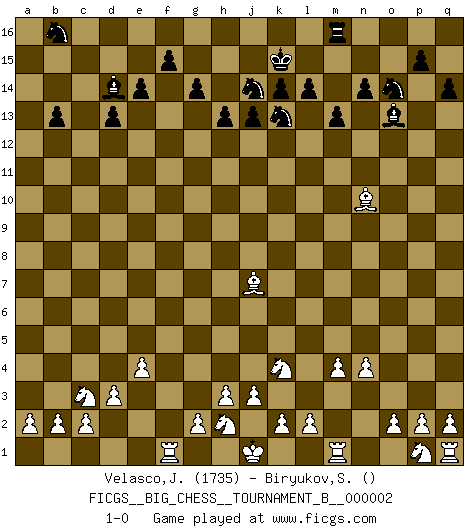 Last move : 1-0 2011 September 20 22:34:28 [Event "FICGS__BIG_CHESS__TOURNAMENT_B__000002"] [Site "FICGS"] [Date "2011.07.15"] [Round "1"] [White "Velasco,Jose Maria"] [Black "Biryukov,Sergey"] [Result "1-0"] [WhiteElo "1735"] [BlackElo ""] 1.j2-k4 j15-k13 2.h1-o7 g15-g14 3.o7-o15 p16-o14 4.o15-f7 h16-f14 5.f7-f14 g16-f14 6.m2-m4 m15-m13 7.l1-o4 l16-o13 8.o4-c15 n15-n14 9.d2-d3 d15-d14 10.c15-a13 b16-a14 11.n2-n4 h14-h13 12.o1-c12 b15-b14 13.a13-d10 d14-d13 14.c12-b13 o16-c5 15.b13-e16 c5-f2 16.e16-c14 a16-b16 17.e1-d1 f2-g1 18.d10-f12 c16-b15 19.f12-b16 g1-h2 20.k1-h2 b15-c14 21.b16-a15 b14-b13 22.c1-j7 e15-e14 23.e2-e4 j14-j13 24.f1-e2 q15-q14 25.e2-n10 l15-l14 26.d1-f1 k16-j14 27.a15-d12 k15-k14 28.d12-f14 h15-f14 29.f1-f14 c14-e16 30.b1-c3 f16-e15 31.f14-f6 e15-a11 32.f6-c6 a14-b16 33.c6-c16 a11-d14 34.c16-e16 j16-k15 35.e16-m16 q16-m16 36.a1-f1 1-0 This big chess game has been lost on time (started : 2011.07.15 11:54:33) Follow this game move after move (download)When you play Bobby, it is not a question if you win or lose. It is a question if you survive. (Boris Spassky) Mutter, ich bin eben Ex-Weltmeister geworden. --beim nach Hause Kommen nach dem Verlust des WM-Titels an Mihail Botvinnik -- (Mikhail Nekhemyevich Tal) La vida es como un juego de Ajedrez, cambiando con cada movimiento. (Proverbio Chino) Psychologiquement, tu dois avoir confiance en toi même, mais cette confiance doit être basée sur des faits. (Robert Fischer) A person who never made a mistake never tried anything new. (Albert Einstein)