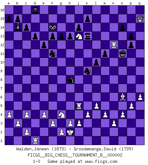 Last move : 1-0 2011 December 18 16:39:5 [Event "FICGS__BIG_CHESS__TOURNAMENT_B__000002"] [Site "FICGS"] [Date "2011.07.15"] [Round "1"] [White "Walden,Janeen"] [Black "Grosdemange,David"] [Result "1-0"] [WhiteElo "1873"] [BlackElo "1739"] 1.j2-k4 j15-h13 2.h2-g4 p16-o14 3.m2-m4 b16-c14 4.e2-e4 e15-e13 5.f1-c4 k16-l14 6.d2-d3 m15-m13 7.b1-c3 l16-p12 8.k1-h2 n15-n14 9.p1-o3 g16-f14 10.c1-h6 f16-c13 11.l1-p5 d15-d13 12.n2-n3 c16-l8 13.o1-k5 h16-k14 14.l2-l4 a16-d16 15.h1-k3 g15-g13 16.g1-j2 c13-b14 17.e1-e3 e13-e12 18.q2-q4 c14-e13 19.e3-f3 e13-f11 20.a1-e1 o16-h10 21.j2-h4 l14-k12 22.c3-d5 h15-j13 23.b2-b3 j16-h15 24.a2-a4 l15-l13 25.o3-n5 l13-l12 26.l4-l5 k12-h11 27.o2-o4 k14-k12 28.e1-e3 m16-m14 29.p2-p4 m14-k14 30.k3-m3 q15-q13 31.d5-f6 h10-c5 32.e3-e2 m13-m12 33.f3-f5 c5-g9 34.f6-h7 g9-e7 35.h7-k6 l8-o11 36.h4-g6 e7-g9 37.g6-j5 f14-g12 38.h2-j4 l12-l11 39.j1-h2 g12-h10 40.f2-f3 g9-e11 41.k4-m5 q16-l16 42.k2-k4 m12-m11 43.k5-l4 h13-j11 44.h6-f8 j13-g12 45.n5-m7 l11-l10 46.g4-h6 h11-g9 47.m5-n7 o11-m13 48.p5-o6 o14-n12 49.p4-p5 n12-l11 50.l4-j6 m13-c4 51.d3-c4 l11-k9 52.j6-p12 q13-p12 53.m1-d1 c15-c14 54.d1-d3 j11-g10 55.f8-g7 o15-o14 56.q4-q5 n14-n13 57.q5-q6 k12-j12 58.q1-d1 g9-j8 59.k6-j8 h10-j8 60.h6-j8 j12-j8 61.m7-k6 j8-j12 62.f5-h5 g12-h10 63.n7-l8 e11-h8 64.g7-h8 g10-h8 65.l8-k10 j12-m12 66.k6-j8 h10-j8 67.k10-j8 f15-f13 68.j4-k6 l16-l12 69.e2-d2 e16-l16 70.d3-d7 h14-h13 71.d7-h7 h15-g14 72.k6-l8 l12-g12 73.j5-g4 l16-l12 74.l8-k10 l12-k12 75.m3-q7 m12-n11 76.h7-n7 n11-o11 77.d2-d5 n13-n12 78.q7-q15 p15-p13 79.k10-h11 k12-j12 80.j8-k10 j12-j10 81.h5-j5 j10-j5 82.d5-j5 g12-k12 83.h11-k12 k14-k12 84.k10-h11 k12-k13 85.h11-j13 g14-f14 86.n7-n12 1-0 This big chess game has been lost on time (started : 2011.07.15 11:54:33) Follow this game move after move (download)The hallmark of the artist is simplicity. (Larry Evans) Sie bekommen vielleicht den Eindruck, dass die Spitzenspieler überhaupt gar nicht so stark sind. Aber das stimmt nicht. Es ist eine Illusion. Mit einem Computer an der Seite ist es sehr leicht, Urteile zu fällen, aber wenn man alleine am Brett sitzt, sieht die Sache ganz anders aus. (Vladimir Kramnik) Bobby Fischer es el jugador de Ajedrez mas grande que jamás haya existido. (Ken Smith) La vérité est comme le meilleur coup aux échecs : elle existe, mais il faut la chercher. (Arturo Perez-Reverte) Life is pain my dear and anyone who says otherwise is selling something. (Princess Bride)