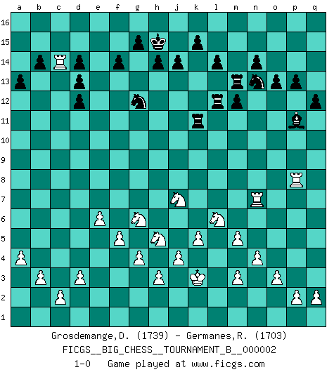 Last move : 1-0 2012 January 4 11:18:13 [Event "FICGS__BIG_CHESS__TOURNAMENT_B__000002"] [Site "FICGS"] [Date "2011.07.15"] [Round "1"] [White "Grosdemange,David"] [Black "Germanes,Ramil"] [Result "1-0"] [WhiteElo "1739"] [BlackElo "1703"] 1.j2-h4 j15-h13 2.b1-c3 b16-c14 3.p1-o3 p16-o14 4.e2-e4 p15-p14 5.f1-c4 n15-n14 6.d2-d3 d15-d13 7.m2-m4 m15-m13 8.l1-o4 e15-e13 9.h1-o7 o16-p15 10.c1-p13 k16-m15 11.n2-n3 q15-q14 12.p13-k8 h16-k14 13.h2-j4 f16-d14 14.k1-l3 m15-l13 15.g1-f3 l16-m15 16.o1-m3 m15-j12 17.o7-l4 k14-l14 18.c4-b3 g16-f14 19.e4-e5 c16-h11 20.a2-a4 a15-a14 21.k2-k4 h15-j13 22.j4-l5 h11-f9 23.l4-k3 f9-m3 24.l2-m3 l14-k13 25.m1-l1 j12-k11 26.b3-k11 k13-k11 27.l3-k5 a14-a13 28.l5-j6 a16-a14 29.l1-l13 l15-l14 30.l13-l4 a14-b14 31.b2-b3 k11-c11 32.k8-d2 p15-o16 33.e1-e4 c11-p11 34.o4-p3 o16-m14 35.j1-j2 j16-j15 36.q1-l1 q14-q13 37.a1-e1 o14-n12 38.l4-l8 q13-q12 39.k3-p8 p11-p8 40.l8-p8 q16-q13 41.l1-l5 e16-e14 42.l5-o5 m16-m15 43.f3-g5 f14-e12 44.e4-f4 e14-f14 45.e1-e4 b14-b11 46.f4-f14 h13-f14 47.j2-k3 e12-g13 48.g5-f7 m13-m12 49.o3-n5 b15-b14 50.n5-l6 j15-h15 51.k5-j7 b11-f11 52.e5-e6 m14-p11 53.f2-f4 q13-l13 54.f4-f5 d14-c13 55.k4-k5 o15-o13 56.c3-d5 p14-p13 57.d5-f6 f11-c11 58.e4-c4 c11-k11 59.j3-j4 f14-g12 60.h4-g6 m15-m16 61.g2-g4 m16-m13 62.f6-h5 h15-j15 63.d2-c3 l13-l12 64.c3-h8 c14-d12 65.o5-o9 f15-f14 66.f7-e9 n12-m10 67.o9-o7 j15-h15 68.e9-c10 g13-e14 69.c10-d12 e14-d12 70.m4-m5 j13-g14 71.j6-g5 h15-j15 72.g5-f7 j15-h15 73.f7-e9 g14-f16 74.e9-c10 f16-e14 75.c10-d12 e14-d12 76.n3-n4 m10-o11 77.o7-n7 o11-n13 78.o2-o3 c13-d14 79.h8-d12 e13-d12 80.p3-d14 c15-d14 81.c4-c14 1-0 Follow this game move after move (download)Fischer, who may or may not be mad as a hatter, has every right to be horrified. (Jeremy Silman) Ich liebe den Moment, wenn ich das Ego meines Gegenüber breche. (Robert James Fischer) El juego de Fischer siempre fue nítido, racional y brillante. Uno de los mejores por siempre. (Dave Regis) Nous sommes les pions de la mystérieuse partie d'Echecs jouée par Dieu. Il nous déplace, nous arrête, nous pousse encore, puis nous lance un à un dans la boîte du Néant. Epitaphe sur la tombe de David Janowsky (1868-1927). I know the human being and fish can coexist peacefully. (George W. Bush, Saginaw sept. 29, 2000)