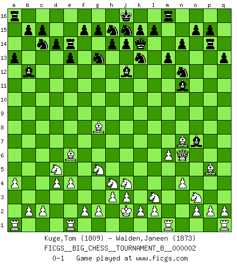 Last move : 0-1 2011 July 25 9:52:37 [Event "FICGS__BIG_CHESS__TOURNAMENT_B__000002"] [Site "FICGS"] [Date "2011.07.15"] [Round "1"] [White "Kuge,Tom"] [Black "Walden,Janeen"] [Result "0-1"] [WhiteElo "1809"] [BlackElo "1873"] 1.d2-d4 j15-k13 2.j2-h4 h15-g13 3.n2-n4 m15-m13 4.m2-m4 e15-e13 5.h1-o7 b16-c14 6.e2-e4 f16-b12 7.g1-f3 d15-d14 8.l1-p5 k16-h15 9.b1-c3 c16-h11 10.p1-o3 p16-o14 11.o1-g8 l16-p12 12.f1-c4 n15-n14 13.c1-l9 o16-l13 14.m4-m5 h16-k14 15.h2-j4 g16-j15 16.k1-l3 h11-j12 17.o7-p8 e16-e14 18.j1-j2 q15-q13 19.m5-m6 a15-a13 20.c4-e6 l13-n11 21.l9-n7 o14-n12 22.c3-d5 q16-q14 23.a2-a4 q14-p14 24.p8-n6 p12-m9 25.f3-g5 m9-o7 0-1 Follow this game move after move (download)In Chess, at least, the brave inherit the earth. (Edmar Mednis) Du musst nicht gut spielen, es reicht, wenn du besser spielst als dein Gegner. (Anonymous) Todo se encuentra en un estado de flujo y esto incluye al mundo del Ajedrez. (Mikhail Botvinnik) Soyez une menace à chaque fois que vous vous asseyez pour jouer. (Ken Smith) Chess is everything: art, science and sport. (Anatoly Karpov)