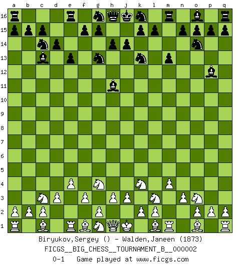 Last move : 0-1 2011 August 31 22:13:19 [Event "FICGS__BIG_CHESS__TOURNAMENT_B__000002"] [Site "FICGS"] [Date "2011.07.15"] [Round "1"] [White "Biryukov,Sergey"] [Black "Walden,Janeen"] [Result "0-1"] [WhiteElo ""] [BlackElo "1873"] 1.e2-e4 j15-k13 2.j2-k4 h15-g13 3.h2-g4 e15-e13 4.b1-c3 m15-m13 5.m2-m4 p16-o14 6.p1-o3 l16-p12 7.f2-f3 b16-c14 8.d2-d3 f16-c13 9.k1-l3 d15-d14 10.n2-n3 c16-h11 0-1 This big chess game has been lost on time (started : 2011.07.15 11:54:33) Follow this game move after move (download)Chess mastery essentially consists of analyzing Chess positions accurately. (Mikhail Botvinnik) Die Elozahlen sind sehr schlecht für das Schach. Jetzt ist Schach eine Sportindustrie, die darauf zielt Elopunkte zu machen. (Miguel Najdorf) Bendita sea la memoria de aquel que dio al mundo este juego inmortal. (A. G. Gardiner) L'attaque fait le spectacle, la défense gagne les matchs. (Dicton footballistique) The ego is not master in its own house. (Sigmund Freud)