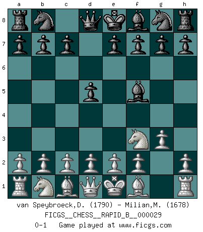 Last move : 0-1 2006 December 27 19:8:28 [Event "FICGS__CHESS__RAPID_B__000029"] [Site "FICGS"] [Date "2006.12.26"] [Round "1"] [White "van Speybroeck,Dirk-Jan"] [Black "Milian,Milan"] [Result "0-1"] [WhiteElo "1790"] [BlackElo "1678"] 1.Nf3 d5 2.g3 Bf5 0-1 Comment by player 1 : Dirk-Jan van Speybroeck : I read you are playing with computer help. Does that mean that you let a program generate your moves? If that's so, I will resign. I can play against Fritz anytime. I don't need a site like Ficgs or Gameknot to play against a computerprogram. Reti : King's Indian attack (Barcza system) Player Black won this chess game. Follow this game move after move (download)In Chess, as it is played by masters, chance is practically eliminated. (Emanuel Lasker) In Buenos Aires ist es nicht mein vorrangiges Ziel ein starkes Turnier zu organisieren, sondern ein Turnier für Gentlemen. Ich würde nie Kamsky einladen. Ich mag keine Probleme. (Miguel Najdorf) No nos podemos resistir a la fascinación de un sacrificio ya que la pasión por los sacrificios es parte de la naturaleza de un jugador de Ajedrez. (Rudolf Spielman) Comme les marins qui ont mille raisons différentes d'aller en mer, les joueurs d'échecs en ont tout autant avant de s'installer devant une table et jouer... (Vincent Bertignac, philosophe) Good decisions come from experience, and experience comes from bad decisions. (Anonymous)