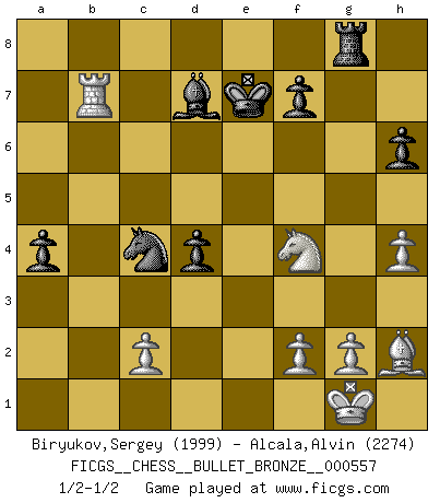 Last move : 1/2-1/2 2011 July 15 15:37:45 [Event "FICGS__CHESS__BULLET_BRONZE__000557"] [Site "FICGS"] [Date "2011.07.15"] [Round "1"] [White "Biryukov,Sergey"] [Black "Alcala,Alvin"] [Result "1/2-1/2"] [WhiteElo "1999"] [BlackElo "2274"] 1.e4 c5 2.Nf3 d6 3.d4 cxd4 4.Nxd4 Nf6 5.Nc3 a6 6.Bg5 Nbd7 7.Be2 e6 8.O-O Be7 9.a4 Nc5 10.Bf3 Nfxe4 11.Bxe7 Nxc3 12.Bxd8 Nxd1 13.Bc7 Nxb2 14.Bxd6 Ncxa4 15.Rfe1 h6 16.h4 Nc4 17.Nf5 Nab6 18.Nxg7+ Kd8 19.Bh2 a5 20.Rab1 a4 21.Be2 Ra5 22.Rb4 Rc5 23.Rd1+ Bd7 24.Bxc4 Nxc4 25.Rxb7 Rd5 26.Rd3 Rg8 27.Nh5 Ke7 28.Rxd5 exd5 29.Nf4 d4 30.Nd5+ Ke6 31.Nf4+ Ke7 32.Nd5+ Ke6 33.Nf4+ Ke7 1/2-1/2 Sicilian : Najdorf, 6.Bg5 Kingside Castling by player White (move 8) This chess game ended in a draw. Follow this game move after move (download)In blitz, the Knight is stronger than the Bishop. (Vlastimil Hort) Ich spiele ehrlich und spiele, um zu gewinnen. Wenn ich verliere nehme ich meine Medizin. (Robert James Fischer) Bobby es la celebridad menos entendida y malinterpretada que camina el la faz de esta tierra. (Yasser Seirawan) Il s'avisa de me proposer d'apprendre les échecs qu'il jouait un peu... me voilà forcené des échecs. J'achète un échiquier, je m'enferme dans ma chambre, j'y passe des jours et des nuits à vouloir apprendre par cur toutes les parties. (Jean-Jacques Rousseau, Confessions) I live to kill Traxler counterattack. (Ilmars Cirulis)