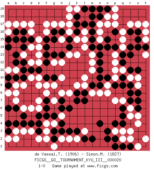 Last move : 1-0 2012 August 21 1:48:58 [Event "FICGS__GO__TOURNAMENT_KYU_III__000020"] [Site "FICGS"] [Date "2011.07.15"] [Round "1"] [Black "de Vassal,Thibault"] [White "Simon,Mickael"] [Result "1-0"] [Rating 1 "1906"] [Rating 2 "1827"] 1.d4 d16 2.q4 q16 3.c14 f17 4.b16 c17 5.d11 r6 6.o3 s4 7.r8 r3 8.q6 r5 9.q5 f3 10.h3 c3 11.c4 d3 12.e4 f2 13.g5 c9 14.c10 e9 15.f10 f9 16.g10 e6 17.f5 g7 18.j6 j8 19.l7 g9 20.f14 h10 21.r11 q7 22.r7 p7 23.p9 o8 24.n9 n8 25.m9 o9 26.o10 m8 27.l8 l9 28.n11 l10 29.k7 e10 30.e11 q3 31.p4 j17 32.r14 o17 33.s16 r17 34.o14 p3 35.n4 m11 36.n10 p10 37.q9 p11 38.n12 m12 39.n13 m13 40.o2 g12 41.f12 q14 42.q13 p13 43.p14 q15 44.r13 s17 45.r16 t16 46.s15 h2 47.j3 j2 48.k3 k2 49.l2 l3 50.m2 c6 51.m14 l14 52.g13 h12 53.m15 h5 54.h6 b17 55.c16 d14 56.d15 e15 57.c15 e14 58.d13 e13 59.f13 c13 60.b13 d12 61.b12 b14 62.a14 a16 63.b15 b11 64.b10 b9 65.a9 a8 66.a10 b8 67.f15 f16 68.r1 d10 69.c12 a11 70.c11 e12 71.s6 s5 72.s7 r2 73.q1 s1 74.p2 q2 75.p1 t2 76.m17 n16 77.m16 k15 78.g16 g17 79.h16 h17 80.n18 o18 81.b4 b3 82.o19 p19 83.n19 p18 84.k18 j18 85.h13 j13 86.j15 j16 87.j14 k13 88.a3 a2 89.a4 b2 90.k17 h15 91.g15 k19 92.l19 j19 93.k16 a17 94.g3 f4 95.e5 g4 96.h4 r10 97.q10 q11 98.s11 s9 99.h7 h8 100.f6 e7 101.b6 b7 102.c5 d6 103.a6 d17 104.o15 l18 105.m19 n17 106.m18 l16 107.e3 e2 108.l17 l15 109.k8 k9 110.g2 g1 111.p16 n15 112.n14 p12 113.q12 p17 114.f7 f8 115.a15 t15 116.t14 t17 117.r9 s10 118.s8 t13 119.s14 1-0 This go game has been lost on time (started : 2011.07.15 16:27:9) Here are the names of the openings (joseki) played in the four corners : Corner d16 : d16 c14 Hoshi (Hwajeom, Seongjeom, Xingwei`) 4-4 Point. The star or hoshi (4-4) point, emphasizing influence at the potential expense of territory. Ikken Kakari (Hankan Keolch'im, Yi Gua`jiao~, 1-Space Low Approach). Black 2 is the standard approach move to the 4-4. Corner q4 : q4 r6 Hoshi (Hwajeom, Seongjeom, Xingwei`) 4-4 Point. The star or hoshi (4-4) point, emphasizing influence at the potential expense of territory. Ikken Kakari (Hankan Keolch'im, Yi Gua`jiao~, 1-Space Low Approach). White 2 is the standard approach move to the 4-4. Corner d4 : d4 f3 Hoshi (Hwajeom, Seongjeom, Xingwei`) 4-4 Point. The star or hoshi (4-4) point, emphasizing influence at the potential expense of territory. Ikken Kakari (Hankan Keolch'im, Yi Gua`jiao~, 1-Space Low Approach). White 2 is the standard approach move to the 4-4. Corner q16 : q16 r11 Hoshi (Hwajeom, Seongjeom, Xingwei`) 4-4 Point. The star or hoshi (4-4) point, emphasizing influence at the potential expense of territory. Player Black won this Go (weiqi, baduk) game. Follow this game move after move (download)In the corner, five stones in a row on the third line are alive. (Anonymous) The bottom line is always the bottom line. (Johann Piek)