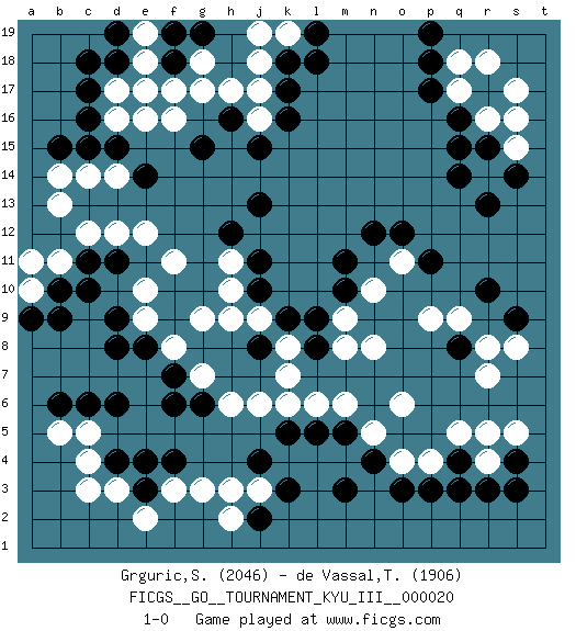 Last move : 1-0 2011 December 5 21:18:19 [Event "FICGS__GO__TOURNAMENT_KYU_III__000020"] [Site "FICGS"] [Date "2011.07.15"] [Round "1"] [Black "Grguric,Samuel"] [White "de Vassal,Thibault"] [Result "1-0"] [Rating 1 "2046"] [Rating 2 "1906"] 1.q16 c3 2.p3 d17 3.d4 d3 4.e4 c4 5.d6 c5 6.f7 f3 7.c6 c12 8.k17 q5 9.r3 r4 10.r10 r8 11.q8 r7 12.d15 g17 13.c17 d16 14.c16 f16 15.c10 e12 16.e14 f11 17.g15 j18 18.k18 j17 19.k16 r14 20.q14 r16 21.r15 s15 22.q15 s17 23.r17 s16 24.r13 q17 25.p17 q18 26.p18 r18 27.h12 e9 28.d8 h11 29.j11 h10 30.j13 c14 31.c15 b14 32.j10 n10 33.n12 n8 34.m3 q9 35.p11 p9 36.d18 e18 37.c18 j3 38.f18 e19 39.e17 e16 40.d19 f17 41.f19 e17 42.h16 h17 43.g19 g18 44.s4 s5 45.q4 r5 46.e3 e2 47.f4 g3 48.k3 n5 49.m11 p4 50.q3 o4 51.d11 d12 52.o3 b11 53.b10 d14 54.b15 a10 55.a9 a11 56.b9 f8 57.j2 h2 58.c11 b13 59.s3 o11 60.o12 k19 61.l19 j19 62.l18 j16 63.j15 g7 64.e8 g9 65.s14 j9 66.j4 h3 67.b6 b5 68.f6 j6 69.m10 m9 70.k5 k6 71.l5 l6 72.k9 k8 73.j8 h9 74.l8 k7 75.l9 m8 76.g6 h6 77.m5 m6 78.d9 e10 79.n4 o6 80.s9 s8 81.p19 1-0 Here are the names of the openings (joseki) played in the four corners : Corner d4 : c3 d4 San-San (Sam-Sam, San-San) 3-3 Point. The San-San (3-3) point, emphasizing territory at the expense of influence. Kata-tsuki (shoulder hit). The shoulder-hit is the traditional answer to the 3-3. The direction of White 3 depends on the positions on the side. Crawling once may be the premise for a follow-up move of sliding with a knight's move in the opposite direction. If White plays 3 at 3-4 (to the right), the follow-on knight's move is then played at the top (e.g. 3-4, 4-5, 5-2). White's knight's move reduces territory potential on the side it is played. Corner q4 : p3 q5 Mokuhazushi (Waemok, Wai`mu`) 5-3 Point. The mokuhazushi (5-3) point was popular in the Edo period in Japan (1600 - 1867). It emphasizes influence; territorially, it is inferior to the 3-4 point. Takamoku Kakari. White prevents Black from gaining influence, but in the local context, abandoning profit in the corner entails a loss. Black 3-4 and 4-4 are best. Corner q16 : q16 r14 Hoshi (Hwajeom, Seongjeom, Xingwei`) 4-4 Point. The star or hoshi (4-4) point, emphasizing influence at the potential expense of territory. Ikken Kakari (Hankan Keolch'im, Yi Gua`jiao~, 1-Space Low Approach). White 2 is the standard approach move to the 4-4. Player Black won this Go (weiqi, baduk) game. Follow this game move after move (download)Atari, atari is vulgar play. (Anonymous) The best teachers teach from the heart, not from the book. (Author unknown)