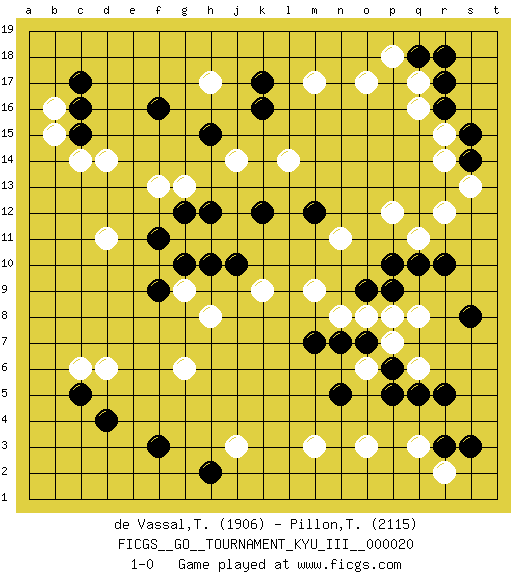 Last move : 1-0 2011 November 30 2:30:56 [Event "FICGS__GO__TOURNAMENT_KYU_III__000020"] [Site "FICGS"] [Date "2011.07.15"] [Round "1"] [Black "de Vassal,Thibault"] [White "Pillon,Thibault"] [Result "1-0"] [Rating 1 "1906"] [Rating 2 "2115"] 1.d4 q3 2.c17 q16 3.k16 d14 4.f16 d11 5.r5 q8 6.p5 o3 7.n5 m3 8.r10 c6 9.f3 r12 10.p10 p12 11.o9 m17 12.r17 q17 13.r16 r15 14.s15 r14 15.s14 q11 16.q10 s13 17.q18 p18 18.r18 o17 19.k17 j3 20.c5 d6 21.c15 c14 22.h2 h17 23.h15 b16 24.c16 b15 25.r3 r2 26.s3 g6 27.f9 q6 28.q5 o6 29.p6 p7 30.o7 o8 31.n7 n8 32.p9 p8 33.m7 m9 34.s8 k9 35.f11 f13 36.g12 g13 37.h12 j14 38.k12 l14 39.m12 n11 40.j10 h8 41.h10 g9 42.g10 1-0 This go game has been lost on time (started : 2011.07.15 16:27:9) Here are the names of the openings (joseki) played in the four corners : Corner d16 : c17 d14 San-San (Sam-Sam, San-San) 3-3 Point. The San-San (3-3) point, emphasizing territory at the expense of influence. Niken Takagakari (Dukan Nop'dakeolch'im, E`r Gaogua`jiao~, 2-Space High Approach). Black may continue with 4-5 or 4-6. Black 4-6 works well when Black is in the lower right (so an extension in the middle works both ways). The more conservative 4-5 is makes a slightly tighter shape (better for a fight). Corner q4 : q3 r5 Komoku (Somok, Xiao~mu`) 3-4 Point. The komoku (3-4) point is the traditional corner enclosure move.. Ikken Kakari (Hankan Keolch'im, Yi Gua`jiao~, 1-Space Low Pincer). The small knight move is the basic approach move to the 3-4 point stone. It has been continually used for over four centuries. There are limitless variations, with new moves constantly being discovered. Black 2 opens the door to a treaure store of joseki. Corner d4 : d4 c6 Hoshi (Hwajeom, Seongjeom, Xingwei`) 4-4 Point. The star or hoshi (4-4) point, emphasizing influence at the potential expense of territory. Ikken Kakari (Hankan Keolch'im, Yi Gua`jiao~, 1-Space Low Approach). White 2 is the standard approach move to the 4-4. Player Black won this Go (weiqi, baduk) game. Follow this game move after move (download)Eyes win semiais. (Anonymous) Industry executives and analysts often mistakenly talk about strategy as if it were some kind of chess match. But in chess, you have just two opponents, each with identical resources, and with luck playing a minimal role. The real world is much more like a poker game, with multiple players trying to make the best of whatever hand fortune has dealt them. In our industry, Bill Gates owns the table until someone proves otherwise. (David Moschella, 'Computerworld')