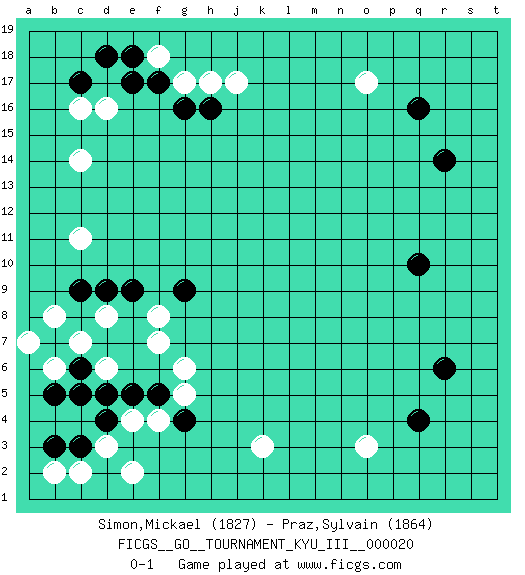 Last move : 0-1 2011 October 6 12:43:25 [Event "FICGS__GO__TOURNAMENT_KYU_III__000020 "] [Site "FICGS"] [Date "2011.07.15"] [Round "1"] [Black "Simon,Mickael "] [White "Praz,Sylvain "] [Result "0-1"] [Rating 1 "1827"] [Rating 2 "1864"] 1.q16 d16 2.q4 d3 3.f17 c14 4.d18 g17 5.g16 h17 6.h16 f18 7.e17 j17 8.c17 c16 9.e18 c11 10.c5 o17 11.r14 e4 12.c9 o3 13.r6 k3 14.q10 c7 15.e5 d6 16.d5 f4 17.e9 f7 18.g9 d8 19.d9 g6 20.b7 b6 21.c6 b8 22.b5 a7 23.c3 c2 24.b3 b2 25.d4 f8 26.f5 g5 27.g4 e2 0-1 Here are the names of the openings (joseki) played in the four corners : Corner d16 : d16 f17Hoshi (Hwajeom, Seongjeom, Xingwei`) 4-4 Point. The star or hoshi (4-4) point, emphasizing influence at the potential expense of territory.Ikken Kakari (Hankan Keolch'im, Yi Gua`jiao~, 1-Space Low Approach). Black 2 is the standard approach move to the 4-4. Corner d4 : d3 c5Komoku (Somok, Xiao~mu`) 3-4 Point. The komoku (3-4) point is the traditional corner enclosure move..Ikken Kakari (Hankan Keolch'im, Yi Gua`jiao~, 1-Space Low Pincer). The small knight move is the basic approach move to the 3-4 point stone. It has been continually used for over four centuries. There are limitless variations, with new moves constantly being discovered. Black 2 opens the door to a treaure store of joseki. Corner q16 : q16 o17Hoshi (Hwajeom, Seongjeom, Xingwei`) 4-4 Point. The star or hoshi (4-4) point, emphasizing influence at the potential expense of territory.Ikken Kakari (Hankan Keolch'im, Yi Gua`jiao~, 1-Space Low Approach). White 2 is the standard approach move to the 4-4. Corner q4 : q4 o3Hoshi (Hwajeom, Seongjeom, Xingwei`) 4-4 Point. The star or hoshi (4-4) point, emphasizing influence at the potential expense of territory.Ikken Kakari (Hankan Keolch'im, Yi Gua`jiao~, 1-Space Low Approach). White 2 is the standard approach move to the 4-4. Player White won this Go (weiqi, baduk) game.Follow this game move after move (download ) Atari, atari is vulgar play. (Anonymous) The weakness of an artist is dogma. (Josh Waitzkin)