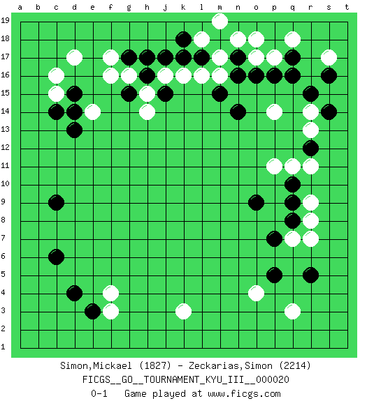 Last move : 0-1 2011 October 5 14:12:42 [Event "FICGS__GO__TOURNAMENT_KYU_III__000020 "] [Site "FICGS"] [Date "2011.07.15"] [Round "1"] [Black "Simon,Mickael "] [White "Zeckarias,Simon "] [Result "0-1"] [Rating 1 "1827"] [Rating 2 "2214"] 1.q16 d17 2.d4 q3 3.d15 c15 4.c14 c16 5.d13 f17 6.c9 r14 7.r12 p14 8.o16 q11 9.r15 r11 10.s14 r13 11.r5 r7 12.p5 o4 13.q8 q7 14.p7 r8 15.q9 r9 16.q10 p11 17.o9 k3 18.h17 f3 19.e3 f4 20.c6 m17 21.n17 m16 22.n14 p17 23.p16 n18 24.q17 o17 25.n16 q18 26.m18 o18 27.m15 l18 28.l17 l16 29.k17 k16 30.j17 s17 31.s16 e14 32.d14 h15 33.k18 m19 34.g17 f16 35.j15 j16 36.g15 g16 37.h16 h14 0-1 Here are the names of the openings (joseki) played in the four corners : Corner d16 : d17 d15Komoku (Somok, Xiao~mu`) 3-4 Point. The komoku (3-4) point is the traditional corner enclosure move..Ikken Takagakari (Hankan Nop'dakeolch'im, Yi Gaogua`jiao~, 1-Space High Approach). The 5-4 approach move has become more popular in modern times, as modern Go emphasizes speed and influence. Corner q16 : q16 r14Hoshi (Hwajeom, Seongjeom, Xingwei`) 4-4 Point. The star or hoshi (4-4) point, emphasizing influence at the potential expense of territory.Ikken Kakari (Hankan Keolch'im, Yi Gua`jiao~, 1-Space Low Approach). White 2 is the standard approach move to the 4-4. Corner q4 : q3 r5Komoku (Somok, Xiao~mu`) 3-4 Point. The komoku (3-4) point is the traditional corner enclosure move..Ikken Kakari (Hankan Keolch'im, Yi Gua`jiao~, 1-Space Low Pincer). The small knight move is the basic approach move to the 3-4 point stone. It has been continually used for over four centuries. There are limitless variations, with new moves constantly being discovered. Black 2 opens the door to a treaure store of joseki. Player White won this Go (weiqi, baduk) game.Follow this game move after move (download ) Fighting must not be the key to go, it should be reserved as your last resource. (Zhong-Pu Liu, about Weiqi) May I never be complete. May I never be content. May I never be perfect. Deliver me, Tyler, from being perfect and complete. (Chuck Palahniuk, Fight Club)