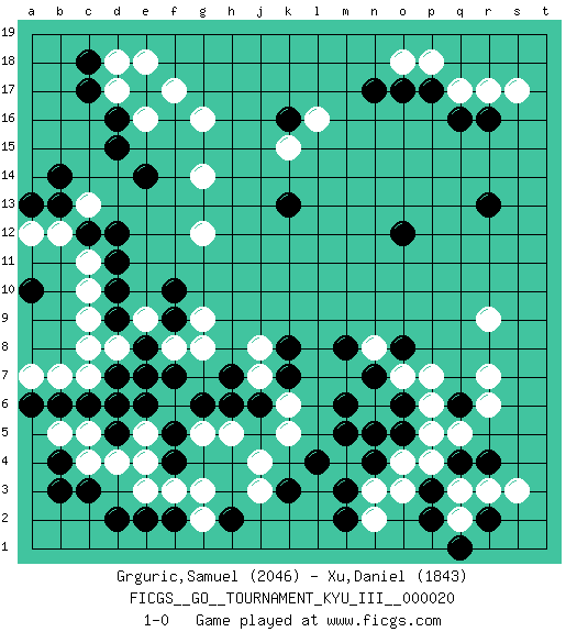 Last move : 1-0 2011 September 23 16:41:15 [Event "FICGS__GO__TOURNAMENT_KYU_III__000020"] [Site "FICGS"] [Date "2011.07.15"] [Round "1"] [Black "Grguric,Samuel"] [White "Xu,Daniel"] [Result "1-0"] [Rating 1 "2046"] [Rating 2 "1843"] 1.q16 d4 2.p3 d17 3.k16 r9 4.c6 c8 5.e6 f3 6.d9 c9 7.d10 d8 8.e8 c10 9.d11 c11 10.d12 c13 11.e14 g16 12.r13 r6 13.c3 j3 14.d15 g14 15.e17 e16 16.d16 f17 17.c17 d18 18.c18 e18 19.k3 j4 20.r4 q17 21.p17 r17 22.r16 p18 23.o17 o18 24.n17 s17 25.o12 c4 26.b4 b5 27.b3 c5 28.e2 e3 29.f2 g2 30.d2 f8 31.e7 e9 32.f9 n3 33.m3 m4 34.n4 g9 35.f10 n2 36.m2 o4 37.n5 o3 38.l4 q3 39.q6 r7 40.q4 p4 41.p2 q2 42.r2 p6 43.j6 n6 44.m5 q5 45.b6 g5 46.q1 k5 47.o5 p5 48.m6 k6 49.n7 o7 50.o8 n8 51.o6 p7 52.m8 k15 53.k7 j7 54.h7 j8 55.g6 h5 56.h6 e5 57.k8 l16 58.h2 g3 59.f4 f6 60.f7 d6 61.d7 c7 62.d5 s3 63.d6 r3 64.k13 g12 65.c12 b12 66.b14 b7 67.a6 a7 68.b13 a12 69.a10 g8 70.f5 e4 71.a13 1-0 Here are the names of the openings (joseki) played in the four corners : Corner q4 : p3 r9 Mokuhazushi (Waemok, Wai`mu`) 5-3 Point. The mokuhazushi (5-3) point was popular in the Edo period in Japan (1600 - 1867). It emphasizes influence; territorially, it is inferior to the 3-4 point. Corner d4 : d4 c6 Hoshi (Hwajeom, Seongjeom, Xingwei`) 4-4 Point. The star or hoshi (4-4) point, emphasizing influence at the potential expense of territory. Ikken Kakari (Hankan Keolch'im, Yi Gua`jiao~, 1-Space Low Approach). Black 2 is the standard approach move to the 4-4. Corner d16 : d17 d11 Komoku (Somok, Xiao~mu`) 3-4 Point. The komoku (3-4) point is the traditional corner enclosure move.. Player Black won this Go (weiqi, baduk) game. Follow this game move after move (download)Don't get surrounded ! Ever ! (Anonymous) The leaves of memory seemed to make a mournful rustling in the dark. (Henry Wadsworth Longfellow)