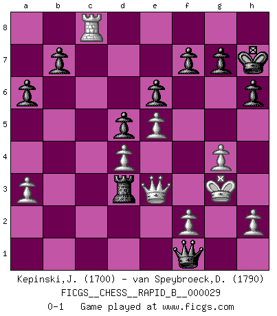Last move : 0-1 2007 February 2 22:59:13 [Event "FICGS__CHESS__RAPID_B__000029"] [Site "FICGS"] [Date "2006.12.26"] [Round "1"] [White "Kepinski,Janusz"] [Black "van Speybroeck,Dirk-Jan"] [Result "0-1"] [WhiteElo "1700"] [BlackElo "1790"] 1.e4 c5 2.b4 cxb4 3.d4 d5 4.e5 Bf5 5.Bd3 Bxd3 6.Qxd3 e6 7.Nf3 Nc6 8.O-O Nge7 9.Bg5 Qc7 10.Nbd2 h6 11.Be3 Nf5 12.Rac1 Be7 13.c4 bxc3 14.Rxc3 O-O 15.Rfc1 Rac8 16.R3c2 Qd7 17.a3 Rc7 18.Bf4 Rfc8 19.Rc3 a6 20.g4 Nh4 21.Nxh4 Bxh4 22.Nb3 Be7 23.Nc5 Bxc5 24.Rxc5 Na5 25.Rxa5 Rxc1+ 26.Bxc1 Rxc1+ 27.Kg2 Qc6 28.Qd2 Qc4 29.Rc5 Qf1+ 30.Kg3 Rd1 31.Rc8+ Kh7 32.Qe3 Rd3 0-1 Sicilian : wing gambit Kingside Castling by player White (move 8) Kingside Castling by player Black (move 14) Player Black won this chess game. Follow this game move after move (download)Fischer Chess play was always razor-sharp, rational and brilliant. One of the best ever. (Dave Regis) Ich las kürzlich ein Buch von Nietzsche. Er sagte Religion verdumme nur die Menschen. Ich stimme zu. (Robert James Fischer) Cuando tu no sabes absolutamente que mas hacer, es tiempo de entrar en pánico. (John van der Wiel) J'apprécie les joueurs d'est-indienne, c'est grâce à eux que je nourris ma famille depuis tant d'années. (Petrosian) If you don't practice you don't deserve to win. (Andre Agassi)