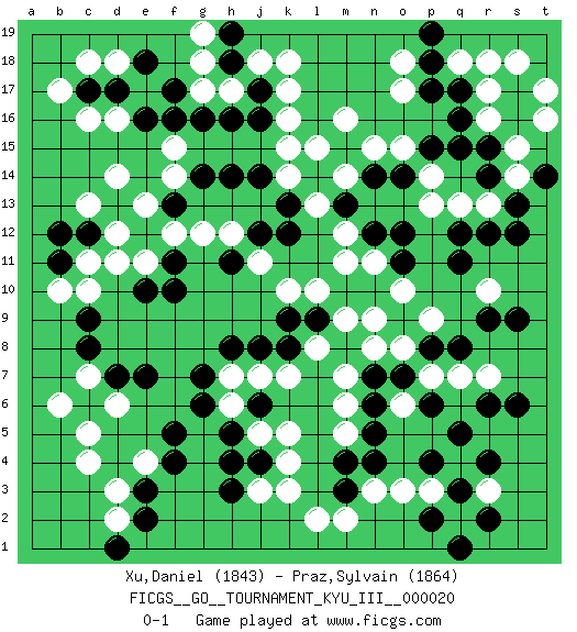 Last move : 0-1 2011 August 24 12:17:40 [Event "FICGS__GO__TOURNAMENT_KYU_III__000020"] [Site "FICGS"] [Date "2011.07.15"] [Round "1"] [Black "Xu,Daniel"] [White "Praz,Sylvain"] [Result "0-1"] [Rating 1 "1843"] [Rating 2 "1864"] 1.q16 d16 2.q3 d3 3.r9 n3 4.q5 k4 5.c6 c4 6.c9 c11 7.j4 j3 8.h3 j5 9.h4 k3 10.h5 h6 11.j6 k5 12.g6 h7 13.f5 d6 14.g7 c7 15.h8 j7 16.j8 k7 17.d7 b6 18.c8 c5 19.e7 o17 20.r14 k16 21.f17 e17 22.f16 d14 23.j17 k17 24.j16 k15 25.h14 f14 26.j14 o15 27.q12 r7 28.r6 q7 29.s6 o6 30.c12 d12 31.b12 c13 32.b11 r17 33.q17 q18 34.p18 r18 35.p17 s15 36.r15 s14 37.s13 r16 38.t14 t16 39.q15 p13 40.o14 p14 41.p15 n15 42.n14 m14 43.o12 m12 44.n12 n11 45.o11 m11 46.c17 c16 47.e18 d18 48.d17 c18 49.e16 b17 50.e10 r3 51.r4 q2 52.p2 p3 53.p4 q4 54.s17 s18 55.q3 o3 56.r2 q4 57.s16 t17 58.q3 r13 59.r12 q4 60.m15 m16 61.q3 q13 62.s12 q4 63.m13 l15 64.q3 b10 65.q1 c10 66.o9 o18 67.p19 l13 68.p6 p7 69.o7 o8 70.n7 n8 71.m8 n9 72.p8 p9 73.q8 m7 74.n6 m6 75.n5 o10 76.q11 m5 77.n4 r10 78.s9 j18 79.h18 k18 80.m3 m2 81.m4 l2 82.k12 g12 83.h11 k10 84.k8 l8 85.l9 m9 86.k9 l10 87.e12 e11 88.f11 d11 89.f10 f12 90.e2 d2 91.e3 e4 92.f4 h12 93.d1 g18 94.h19 h17 95.h16 g17 96.j12 j11 97.g16 g19 98.g14 f15 99.f13 e13 100.k13 k14 0-1 Here are the names of the openings (joseki) played in the four corners : Corner d4 : d3 c6 Komoku (Somok, Xiao~mu`) 3-4 Point. The komoku (3-4) point is the traditional corner enclosure move.. Niken Kakari (Dukan Keolch'im, E`r Gua`jiao~, 2-Space Low Approach). Black 2 is used with friendly forces backing it up. Its purpose is to prevent a pincer. Locally it results in a loss, but may be appropriate fuseki strategy. It was popular in the late 1950s and early 1960s, but is not seen often nowadays, having been replaced by the one-space high approach, with which it has points in common. Corner q16 : q16 o17 Hoshi (Hwajeom, Seongjeom, Xingwei`) 4-4 Point. The star or hoshi (4-4) point, emphasizing influence at the potential expense of territory. Ikken Kakari (Hankan Keolch'im, Yi Gua`jiao~, 1-Space Low Approach). White 2 is the standard approach move to the 4-4. Player White won this Go (weiqi, baduk) game. Follow this game move after move (download)Avoid the plate connection. (Anonymous) Big Chess is a place for big hallucinations. (Thibault de Vassal)