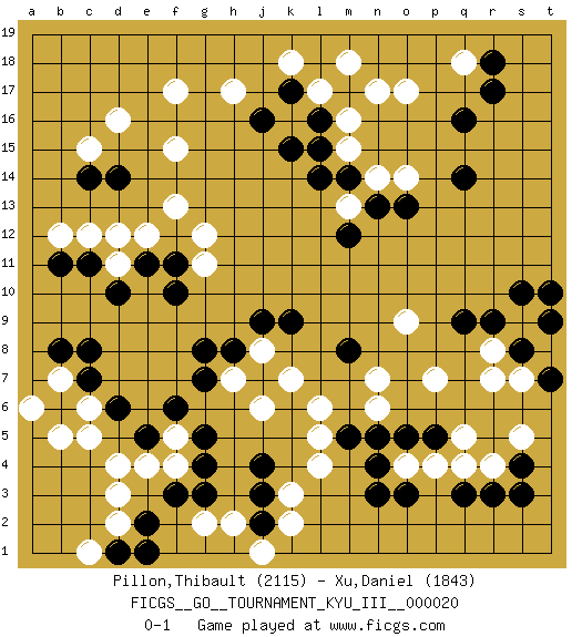 Last move : 0-1 2011 December 1 2:42:21 [Event "FICGS__GO__TOURNAMENT_KYU_III__000020"] [Site "FICGS"] [Date "2011.07.15"] [Round "1"] [Black "Pillon,Thibault"] [White "Xu,Daniel"] [Result "0-1"] [Rating 1 "2115"] [Rating 2 "1843"] 1.q16 d4 2.q3 d16 3.f3 c6 4.r9 o17 5.q14 k16 6.c14 f17 7.c11 c15 8.c8 d2 9.j4 l4 10.n3 k3 11.j3 l6 12.m17 m16 13.l16 l17 14.l15 m18 15.k17 n17 16.j16 m15 17.k15 r8 18.q9 s9 19.s10 s7 20.t9 t8 21.s8 o4 22.o3 s9 23.t10 r4 24.r3 q4 25.m14 q18 26.d14 n14 27.n13 m13 28.l14 o14 29.o13 f15 30.n4 k7 31.e2 d3 32.f6 p7 33.b6 b5 34.d6 b7 35.c7 c5 36.s8 r7 37.t7 n7 38.r17 o9 39.m5 l5 40.k9 f13 41.h8 j8 42.j9 h7 43.g8 j6 44.f11 g12 45.r18 k18 46.m12 g11 47.f10 h17 48.s4 s5 49.s3 f4 50.g4 f5 51.g5 g2 52.g3 h2 53.e5 e4 54.g7 k2 55.b8 a6 56.d1 c1 57.e1 e12 58.p5 p4 59.o5 d11 60.d10 c12 61.e11 d12 62.b11 b12 63.j2 j1 64.m8 n6 65.n5 q5 0-1 This go game has been lost on time (started : 2011.07.15 16:27:9) Here are the names of the openings (joseki) played in the four corners : Corner d4 : d4 f3 Hoshi (Hwajeom, Seongjeom, Xingwei`) 4-4 Point. The star or hoshi (4-4) point, emphasizing influence at the potential expense of territory. Ikken Kakari (Hankan Keolch'im, Yi Gua`jiao~, 1-Space Low Approach). Black 2 is the standard approach move to the 4-4. Corner q16 : q16 o17 Hoshi (Hwajeom, Seongjeom, Xingwei`) 4-4 Point. The star or hoshi (4-4) point, emphasizing influence at the potential expense of territory. Ikken Kakari (Hankan Keolch'im, Yi Gua`jiao~, 1-Space Low Approach). White 2 is the standard approach move to the 4-4. Corner d16 : d16 c14 Hoshi (Hwajeom, Seongjeom, Xingwei`) 4-4 Point. The star or hoshi (4-4) point, emphasizing influence at the potential expense of territory. Ikken Kakari (Hankan Keolch'im, Yi Gua`jiao~, 1-Space Low Approach). Black 2 is the standard approach move to the 4-4. Player White won this Go (weiqi, baduk) game. Follow this game move after move (download)The strong player plays straight, the weak diagonally. (Anonymous) The only thing that overcomes hard luck is hard work. (Harry Golden)