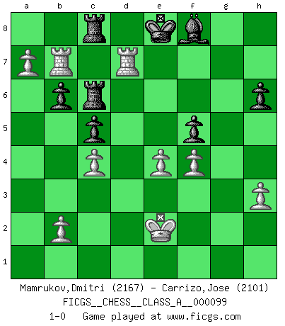 Last move : 1-0 2012 January 17 1:18:35 [Event "FICGS__CHESS__CLASS_A__000099"] [Site "FICGS"] [Date "2011.07.15"] [Round "1"] [White "Mamrukov,Dmitri"] [Black "Carrizo,Jose"] [Result "1-0"] [WhiteElo "2167"] [BlackElo "2101"] 1.d4 d6 2.e4 Nf6 3.Nc3 g6 4.Nf3 Bg7 5.Be3 c6 6.Qd2 Qa5 7.h3 Nbd7 8.Bd3 O-O 9.O-O e5 10.Rad1 Re8 11.dxe5 dxe5 12.Ng5 Nc5 13.Bc4 Ne6 14.Nxe6 Bxe6 15.Bxe6 Rxe6 16.Nd5 Qxd2 17.Nxf6+ Bxf6 18.Rxd2 Kg7 19.Rfd1 b6 20.Rd7 c5 21.g3 Re7 22.Kf1 Rae8 23.R7d5 Rc7 24.a4 Re6 25.a5 Be7 26.a6 Kf8 27.c4 Ke8 28.Ke2 f6 29.R1d3 Rec6 30.f4 exf4 31.Bxf4 Rc8 32.Rd7 g5 33.Rxa7 gxf4 34.R3d7 Bf8 35.gxf4 h6 36.Rab7 f5 37.a7 1-0 Queen's Pawn Kingside Castling by player Black (move 8) Kingside Castling by player White (move 9) Player White won this chess game. Follow this game move after move (download)Spassky will not be psyched out by Fischer. (Mike Goodall) Als ich elf wurde, wurde ich einfach gut. (Robert James Fischer) El Ajedrez lo es todo: arte, ciencia y deporte. (Anatoly Karpov) La tactique, c'est ce que vous faites quand il y a quelque chose à faire; la stratégie, c'est ce que vous faites quand il n'y a rien à faire. (Savielli Tartacower) Chess, like love, like music, has the power to make people happy. (Siegbert Tarrasch)