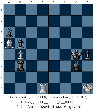 Last move : 0-1 2011 September 28 20:57:16 [Event "FICGS__CHESS__CLASS_A__000099"] [Site "FICGS"] [Date "2011.07.15"] [Round "1"] [White "Teverovski,Bogoljub"] [Black "Mamrukov,Dmitri"] [Result "0-1"] [WhiteElo "2000"] [BlackElo "2167"] 1.d4 Nf6 2.c4 e6 3.g3 d5 4.Bg2 Be7 5.Nf3 O-O 6.O-O dxc4 7.Qc2 a6 8.Qxc4 b5 9.Qc2 Bb7 10.Bd2 Be4 11.Qc1 Nbd7 12.Ba5 Rc8 13.Nbd2 Ba8 14.a3 Nb6 15.b4 Ne4 16.e3 Nxd2 17.Nxd2 Bxg2 18.Kxg2 Qd5+ 19.Kg1 e5 20.dxe5 Na4 21.Qc2 Qxe5 22.Qc6 Qd6 23.Qxd6 cxd6 24.Kg2 f5 25.Nf3 Kf7 26.h4 Bf6 27.Rac1 Ke7 28.h5 Rfe8 29.Rg1 Nb2 30.Bb6 Nd3 31.Rc7+ Rxc7 32.Bxc7 Rc8 33.Bxd6+ Ke6 34.Bf4 Rc3 35.h6 Rxa3 36.hxg7 Bxg7 37.Rd1 h5 38.Bc7 Kd5 39.Nh4 Bf8 40.Ba5 Kc4 41.Nxf5 Ra2 42.Kg1 Rxf2 43.Rxd3 Rxf5 44.Rd8 Rf6 45.Kg2 Bd6 46.Rc8+ Kb3 47.Rc6 Be5 48.Rc1 Rg6 49.Rh1 Bxg3 50.Kf3 h4 51.Rb1+ Kc2 52.Rh1 Rf6+ 53.Kg4 Kd3 54.Rd1+ Kxe3 55.Rc1 Ke2 56.Kh3 Rf3 57.Kg4 Rf4+ 58.Kh3 Rc4 59.Ra1 Rc3 60.Ra2+ Kf1 61.Ra1+ Be1 62.Kh2 Ke2 63.Ra2+ Kf3 64.Ra1 Re3 65.Rd1 Bc3 66.Rf1+ Kg4 67.Rg1+ Rg3 68.Rd1 Be5 69.Kh1 Rh3+ 70.Kg1 Rb3 71.Kh1 Bg3 0-1 Catalan : Closed, 5.Nf3 Kingside Castling by player Black (move 5) Kingside Castling by player White (move 6) 10 pieces endgame at move 54 : White KRBP , Black KRBPPP WHITE : King + 1 Rook 1 Bishop 1 Pawn BLACK : King + 1 Rook 1 Bishop 3 Pawns Player Black won this chess game. Follow this game move after move (download)The sign of a great Master is his ability to win a won game quickly and painlessly. (Irving Chernev) Ein Schachgenie ist jemand der verdammt gut Schach spielt. (Jonathan Levitt) Ayuda a tus piezas para que ellas te puedan ayudar. (Paul Morphy) Toute estimation doit être constamment réévaluée. (Jacob Estrin) He who fights with monsters should be careful lest he thereby become a monster. (Friedrich Nietzsche, Beyond Good and Evil)