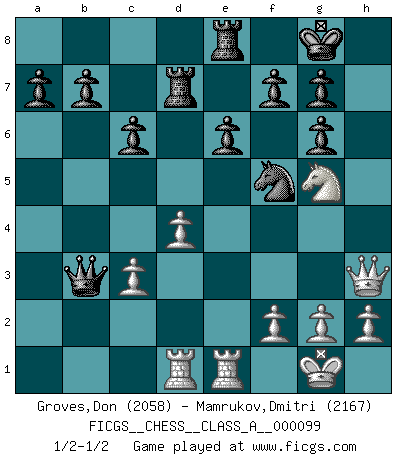 Last move : 1/2-1/2 2011 July 23 8:30:45 [Event "FICGS__CHESS__CLASS_A__000099"] [Site "FICGS"] [Date "2011.07.15"] [Round "1"] [White "Groves,Don"] [Black "Mamrukov,Dmitri"] [Result "1/2-1/2"] [WhiteElo "2058"] [BlackElo "2167"] 1.e4 c6 2.d4 d5 3.Nc3 dxe4 4.Nxe4 Bf5 5.Ng3 Bg6 6.Nf3 Nd7 7.Bd3 e6 8.Bf4 Ngf6 9.Bxg6 hxg6 10.O-O Nd5 11.Bg5 Be7 12.Bxe7 Nxe7 13.Ne4 O-O 14.Qe2 Nf5 15.c3 Qc7 16.Rfe1 Rad8 17.Rad1 Rfe8 18.Neg5 Nd6 19.Qd3 Qa5 20.b3 Qxa2 21.Ne5 Qxb3 22.Nxd7 Rxd7 23.Qh3 Nf5 1/2-1/2 Caro-Kann : Classical variation Kingside Castling by player White (move 10) Kingside Castling by player Black (move 13) This chess game ended in a draw. Follow this game move after move (download)You have to have the fighting spirit. You have to force moves and take chances. (Bobby Fischer) Die größte Kunst beim Schach besteht darin dem Gegner nicht zu zeigen was er tun kann. (Garry Kasparov) Las piezas de Ajedrez son los bloques del alfabeto que moldean los pensamientos; y esos pensamientos, aunque hagan un diseño visual en el tablero, expresan abstractamente su belleza como un poema. (Marcel Duchamp) Un millionnaire : 'Monsieur Steinitz ! Vous ne participez aux tournois que pour l'argent, alors que moi je n'y viens que pour l'honneur.' Steinitz : 'Chacun joue pour ce qu'il n'a pas'... The only sure thing about luck is that it will change. (Wilson Mizner)