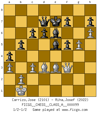 Last move : 1/2-1/2 2012 January 17 10:57:23 [Event "FICGS__CHESS__CLASS_A__000099"] [Site "FICGS"] [Date "2011.07.15"] [Round "1"] [White "Carrizo,Jose"] [Black "Riha,Josef"] [Result "1/2-1/2"] [WhiteElo "2101"] [BlackElo "2022"] 1.e4 e5 2.d4 exd4 3.Qxd4 Nc6 4.Qe3 Nf6 5.Nc3 Bb4 6.Bd2 O-O 7.O-O-O Re8 8.Qg3 Nxe4 9.Nxe4 Rxe4 10.c3 Be7 11.Bd3 Bh4 12.Qf3 Re8 13.Qf4 Ne5 14.Bc2 d6 15.Nf3 Nxf3 16.Qxf3 g6 17.Rhe1 Rxe1 18.Rxe1 Be6 19.Kb1 c6 20.g3 Bf6 21.h4 Bg7 22.h5 Qd7 23.h6 Bh8 24.Bf4 b5 25.Qd1 Rd8 26.Bg5 Re8 27.Bf4 Qe7 28.Bd2 a5 29.f4 Qd7 30.g4 Kf8 31.f5 gxf5 32.g5 Bd5 33.Rxe8+ Kxe8 34.Qg1 a4 35.Qb6 Be5 36.a3 Qc8 37.Qe3 Be6 38.Qf3 Qd7 39.Bd3 Kf8 40.Bf4 Ke7 41.Be3 1/2-1/2 Centre game : Berger variation Kingside Castling by player Black (move 6) Queenside Castling by player White (move 7) This chess game ended in a draw. Follow this game move after move (download)Live, lose, and learn, by observing your opponent how to win. (Amber Steenbock) Schach ist mein Leben, meine Leidenschaft, was ich gelernt habe und seit meinem 14. Lebensjahr profimässig praktiziere. Darauf zu verzichten, würde mir sehr schwer fallen. (Viktor Kortschnoi) Un mal plan es mejor que no tener ningún plan. (Frank Marshall) Il vaut mieux sacrifier les pièces de l'adversaire. (Xavier Tartacover) Be who you are, and say what you feel because those who mind don't matter, and those who matter don't mind. (Dr Seuss)
