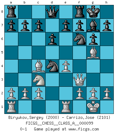Last move : 0-1 2011 September 22 22:43:22 [Event "FICGS__CHESS__CLASS_A__000099"] [Site "FICGS"] [Date "2011.07.15"] [Round "1"] [White "Biryukov,Sergey"] [Black "Carrizo,Jose"] [Result "0-1"] [WhiteElo "2000"] [BlackElo "2101"] 1.e4 d6 2.d4 Nf6 3.Nc3 g6 4.Nf3 Bg7 5.Bc4 O-O 6.O-O Nc6 7.Re1 Bg4 8.Bg5 Bxf3 9.Qxf3 Nxd4 0-1 This chess game has been lost on time (started : 2011.07.15 20:2:25) Pirc : Classical (Two knights) system Kingside Castling by player Black (move 5) Kingside Castling by player White (move 6) Player Black won this chess game. Follow this game move after move (download)The tactician must know what to do whenever something needs doing; the strategist must know what to do when nothing needs doing. (Savielly Tartakover) Schach ist wie eine schöne Frau, zu der wir ständig zurückkehren, gleichviel, wie oft sie uns zurückweist. (Anonymous) Tu no necesitas jugar muy bien, únicamente ayudar a tu oponenet a que juegue muy mal. (Genrikh Chepukaitis) Plusieurs personnes se sont demandées comment Tal faisait pour gagner... En fait, c'est très simple ! Il met ses pièces au centre de l'échiquier et les sacrifie quelque part ! (David Bronstein) Memory is a complicated thing, a relative to truth, but not its twin. (Barbara Kingsolver, Animal Dreams)