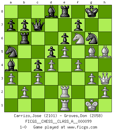 Last move : 1-0 2012 January 4 9:43:5 [Event "FICGS__CHESS__CLASS_A__000099"] [Site "FICGS"] [Date "2011.07.15"] [Round "1"] [White "Carrizo,Jose"] [Black "Groves,Don"] [Result "1-0"] [WhiteElo "2101"] [BlackElo "2058"] 1.e4 e6 2.d4 d5 3.e5 c5 4.c3 Nc6 5.Nf3 Qb6 6.a3 c4 7.Nbd2 Na5 8.Be2 Bd7 9.O-O Be7 10.Rb1 Rc8 11.Re1 Bd8 12.Nf1 Ne7 13.Bg5 h6 14.Bf4 O-O 15.N3d2 Bb5 16.Ne3 Qc6 17.Bh5 Ba4 18.Qg4 Kh7 19.Re2 Qd7 20.Qh3 Nb3 21.Ndf1 Kg8 22.Rbe1 Rc6 23.Ng4 Ng6 24.Nxh6+ gxh6 25.Bxh6 Re8 26.Ne3 Qe7 27.g3 Qd7 28.Ng4 Rb6 29.f4 Na5 30.Bg5 Qc7 31.Nf6+ 1-0 French : Advance, Paulsen attack Kingside Castling by player White (move 9) Kingside Castling by player Black (move 14) Player White won this chess game. Follow this game move after move (download)Though most people love to look at the games of the great attacking masters, some of the most successful players in history have been the quiet positional players. They slowly grind you down by taking away your space, tying up your pieces, and leaving you with virtually nothing to do ! (Yasser Seirawan) Nicht daß Diemer aus Opportunismus Mitglied der NSDAP geworden wäre. Er war ein Fanatiker, in allem, was er tat. (Hans Ree) El Ajedrez es un invernadero donde los frutos del carácter pueden madurar mas completamente que en la vida. (Edward Morgan Foster) Echiquier : carré parfait, comme la Jérusalem nouvelle décrite par l'auteur de l'Apocalypse, huit cases sur huit, exaltation du chiffre 4, symbole du cosmos aux quatre horizons... où le noir et le blanc, l'ombre et la lumière, le mal et le bien s'entremêlent et se conjuguent. (Robert Couffignal, Le Gambit du poète) Somehow our devils are never quite what we expect when we meet them face to face. (Nelson DeMille)