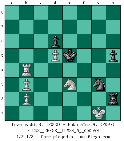Last move : 1/2-1/2 2011 October 4 2:13:58 [Event "FICGS__CHESS__CLASS_A__000099"] [Site "FICGS"] [Date "2011.07.15"] [Round "1"] [White "Teverovski,Bogoljub"] [Black "Bakhmatov,Andrey"] [Result "1/2-1/2"] [WhiteElo "2000"] [BlackElo "2097"] 1.d4 Nf6 2.c4 e6 3.g3 c5 4.d5 exd5 5.cxd5 b5 6.e4 Nxe4 7.Qe2 Qe7 8.Bg2 Nd6 9.Be3 Na6 10.Nc3 b4 11.Na4 g6 12.Rc1 Bb7 13.Nh3 Rc8 14.Rc2 b3 15.axb3 Nb4 16.Rxc5 Ba6 17.Rxc8+ Nxc8 18.Qd2 Bh6 19.Kd1 Bxe3 20.Qxe3 Qxe3 21.fxe3 Ke7 22.Kd2 Nd6 23.Ra1 Nb7 24.Nf2 Rc8 25.Nc3 Nc5 26.Ra3 f5 27.e4 Kf6 28.exf5 gxf5 29.g4 fxg4 30.Nxg4+ Ke7 31.Nd1 Bd3 32.Nde3 a5 33.Ne5 Be4 34.Bxe4 Nxe4+ 35.Ke2 Rf8 36.N5g4 h5 37.Ne5 Rf2+ 38.Ke1 d6 39.Nc6+ Kf6 40.Nxb4 axb4 41.Ra4 Rxh2 42.Rxb4 Ke5 43.Kf1 Ng3+ 44.Kg1 1/2-1/2 Catalan Opening This chess game ended in a draw. Follow this game move after move (download)Help your pieces so they can help you. (Paul Morphy) Viele Opfer benötigen überhaupt keine konkrete Berechnung. Es genügt sich die entstehende Position kurz vorzustellen, um uns davon zu überzeugen, dass das Opfer korrekt ist. (Mikhail Nekhemyevich Tal) El Ajedrez, como cualquier otra actividad creativa, puede existir solo a través de méritos combinados de aquellos que tienen talento creativo y de aquellos que tienen la habilidad de organizar un trabajo creativo. (Mikhail Botvinnik) Il n'y a pas eu de défaite parce que je ne crois pas que cet ordinateur ait jamais existé. IBM a triché en refusant d'imprimer les modes de recherche de la machine. C'est évident, pendant le match, des coups décisifs ont été joués par des êtres humains. Aujourd'hui, les meilleurs spécialistes en informatique ne peuvent toujours pas expliquer comment Deep-Blue a pu jouer contre la logique des ordinateurs. IBM a gagné une guerre de communication, mais ils sont incapables de prouver que l'ordinateur a gagné tout seul. (Garry Kasparov) At last I discovered the true beauty of chess. So I proposed to her. (Dinesh De Silva)