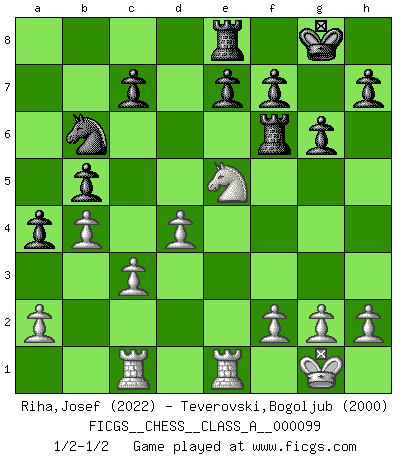 Last move : 1/2-1/2 2011 August 3 14:5:29 [Event "FICGS__CHESS__CLASS_A__000099"] [Site "FICGS"] [Date "2011.07.15"] [Round "1"] [White "Riha,Josef"] [Black "Teverovski,Bogoljub"] [Result "1/2-1/2"] [WhiteElo "2022"] [BlackElo "2000"] 1.Nc3 g6 2.d4 d5 3.e4 dxe4 4.Nxe4 Bg7 5.Nf3 Nc6 6.Bb5 Nf6 7.Nxf6+ Bxf6 8.O-O O-O 9.Bh6 Re8 10.c3 a6 11.Bc4 b5 12.Bd3 Bb7 13.Be4 Na5 14.Qe2 Bxe4 15.Qxe4 Nc4 16.b3 Nd6 17.Qc6 a5 18.Bf4 Qc8 19.Rfe1 a4 20.Be5 Qa6 21.Qxa6 Rxa6 22.b4 Rc6 23.Rac1 Nc4 24.Bxf6 Rxf6 25.Ne5 Nb6 1/2-1/2 Dunst (Sleipner, Heinrichsen) Opening Kingside Castling by player White (move 8) Kingside Castling by player Black (move 8) This chess game ended in a draw. Follow this game move after move (download)My style is somewhere between that of Tal and Petrosian. (Reshevsky) Ich hatte Zahnschmerzen im ersten Spiel. In der zweiten Partie tat mir der Kopf weh. In der dritten war es eine Rheuma-Attacke und während der vierten fühlte ich mich nicht gut. Und in der fünften? Nun, man muss doch nicht jedes Spiel gewinnen, oder? (Savielly Grigorievitsch Tartakower) El Ajedrez es un cuento de Hadas de las 1001 metidas de pata. (Savielly Tartakower) Les ravages du H expliquent la différence de niveau entre Tal et Thal [Abergel]. We're missing something. (Gregory House, House M.D.)