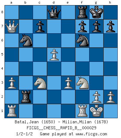 Last move : 1/2-1/2 2007 January 29 15:59:50 [Event "FICGS__CHESS__RAPID_B__000029"] [Site "FICGS"] [Date "2006.12.26"] [Round "1"] [White "Batal,Jean"] [Black "Milian,Milan"] [Result "1/2-1/2"] [WhiteElo "1650"] [BlackElo "1678"] 1.d4 d5 2.Nf3 Bf5 3.e3 Nf6 4.Bd3 Bxd3 5.cxd3 e6 6.O-O Nc6 7.Nc3 Bb4 8.a3 Be7 9.e4 dxe4 10.dxe4 O-O 11.d5 exd5 12.exd5 Nb8 13.Be3 Nbd7 14.Qb3 Bc5 15.Qxb7 Rb8 16.Qa6 Bxe3 17.fxe3 Rxb2 18.Qxa7 Nb6 1/2-1/2 Comment by player 1 : Jean Batal : Thanks for the game and good luck. Jean. Queen's pawn game Kingside Castling by player White (move 6) Kingside Castling by player Black (move 10) This chess game ended in a draw. Follow this game move after move (download)When asked, -How is that you pick better moves than your opponents?, I responded: I'm very glad you asked me that, because, as it happens, there is a very simple answer. I think up my own moves, and I make my opponent think up his. (Alexander Alekhine) Ich kenne keine einzige Person, die behaupten würde, Garri Kasparow sei ein guter Mensch (Nigel Short) La esencia del Ajedrez es pensar acerca de lo que el Ajedrez es. (David Bronstein) Tout change constamment, y compris dans le monde des Echecs. (Botvinnik) When you stop learning you start dying. (Scott Adams)