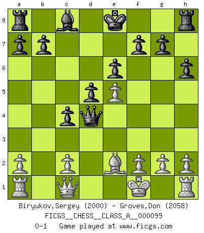 Last move : 0-1 2011 October 8 11:40:46 [Event "FICGS__CHESS__CLASS_A__000099"] [Site "FICGS"] [Date "2011.07.15"] [Round "1"] [White "Biryukov,Sergey"] [Black "Groves,Don"] [Result "0-1"] [WhiteElo "2000"] [BlackElo "2058"] 1.e4 e6 2.d4 d5 3.Nc3 Nf6 4.Bg5 Bb4 5.e5 h6 6.Bd2 Bxc3 7.Bxc3 Ne4 8.Bd3 Nxc3 9.bxc3 c5 10.Nf3 Qa5 11.Qd2 c4 12.Be2 Qa3 13.Ng1 Qb2 14.Qc1 Qxc3+ 15.Kf1 Nc6 16.Nf3 Nxd4 17.Nxd4 Qxd4 0-1 This chess game has been lost on time (started : 2011.07.15 20:2:25) French : MacCutcheon, Lasker variation Player Black won this chess game. Follow this game move after move (download)Examine moves that smite! A good eye for smites is far more important than a knowledge of strategical principles. (Purdy) Ich organisiere ein großes Turnier, was mich etwa 120000 Dollar kostet. Ich denke, das ist das erste Mal in der Schachgeschichte, daß ein Schachgroßmeister auch als Mäzen auftritt. (Miguel Najdorf) Una compensación adecuada por un sacrificio es tener una combinación sólida que conduce a una posición ganadora; una compensación adecuada por una metida de pata es dejar a tu oponente arrebatar una derrota de las fauces de la victoria. (Bruce A. Moon) Les échecs, c'est l'art d'analyser. (Mikhail Botvinnik) As the days dwindle down... to a precious few. (Maxwell Anderson)