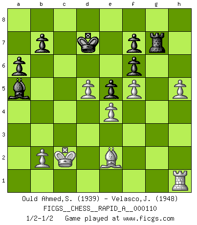 Last move : 1/2-1/2 2011 December 12 22:56:0 [Event "FICGS__CHESS__RAPID_A__000110"] [Site "FICGS"] [Date "2011.07.16"] [Round "1"] [White "Ould Ahmed,Samy"] [Black "Velasco,Jose Maria"] [Result "1/2-1/2"] [WhiteElo "1939"] [BlackElo "1948"] 1.e4 c5 2.Nf3 d6 3.d4 cxd4 4.Nxd4 Nf6 5.Nc3 a6 6.Bg5 e6 7.f4 Qb6 8.Qd2 Nc6 9.Bxf6 gxf6 10.Nb3 Be7 11.Be2 Rg8 12.g3 Bd7 13.O-O-O O-O-O 14.Na4 Qa7 15.a3 Kb8 16.Kb1 Rc8 17.Bh5 Rg7 18.Rhe1 Be8 19.Nc3 Rg8 20.Bf3 Rf8 21.Bg2 h5 22.Re3 Rh8 23.h4 Qb6 24.Rd3 Na7 25.f5 Nb5 26.Ne2 e5 27.a4 Nc7 28.a5 Qf2 29.Nc3 Qxd2 30.Nxd2 Bc6 31.Nc4 Nb5 32.Nb6 Nxc3+ 33.Rxc3 Rcg8 34.Nd5 Bd8 35.Ra3 Rg4 36.c4 Bxd5 37.Rxd5 Be7 38.Rc3 Rhg8 39.R5d3 Rc8 40.Kc2 d5 41.cxd5 Bb4 42.Rxc8+ Kxc8 43.Bf3 Rxg3 44.Bxh5 Rg7 45.Rh3 Bxa5 46.Be2 Kd8 47.h5 Kd7 48.Rh1 1/2-1/2 Sicilian : Najdorf, 7...Qb6 Queenside Castling by player White (move 13) Queenside Castling by player Black (move 13) This chess game ended in a draw. Follow this game move after move (download)Is Bobby Fischer quite sane ? (Salo Flohr) Es liegt in der Natur, vernüftig zu denken und unlogisch zu handeln. (Anatole France) El Ajedrez tiene tanto misterio como las mujeres. (Purdy) Un millionnaire : 'Monsieur Steinitz ! Vous ne participez aux tournois que pour l'argent, alors que moi je n'y viens que pour l'honneur.' Steinitz : 'Chacun joue pour ce qu'il n'a pas'... Everything in life is luck. (Donald Trump)