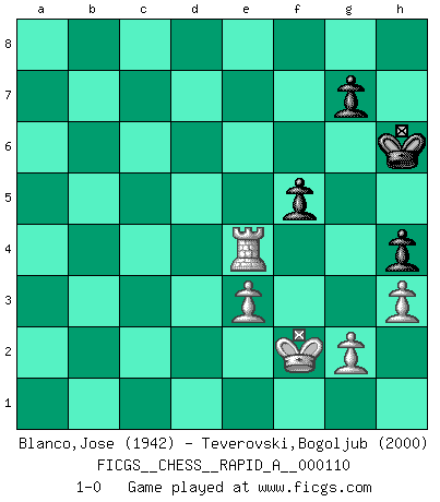 Last move : 1-0 2011 November 20 1:27:29 [Event "FICGS__CHESS__RAPID_A__000110"] [Site "FICGS"] [Date "2011.07.16"] [Round "1"] [White "Blanco,Jose"] [Black "Teverovski,Bogoljub"] [Result "1-0"] [WhiteElo "1942"] [BlackElo "2000"] 1.e4 c5 2.Nf3 Nc6 3.d4 cxd4 4.Nxd4 e5 5.Nb5 d6 6.N1c3 a6 7.Na3 b5 8.Nd5 Nce7 9.c4 Nxd5 10.exd5 bxc4 11.Nxc4 Nf6 12.Be3 Rb8 13.Rc1 Be7 14.Ba7 Ra8 15.Nb6 Bd7 16.Nxa8 Qxa8 17.Be3 Nxd5 18.Bd2 Nf6 19.Qf3 d5 20.Be2 O-O 21.O-O Rb8 22.Rc2 a5 23.Rfc1 Be6 24.Bf1 Ne4 25.Be1 Bg5 26.Rd1 h6 27.Qa3 a4 28.Bd3 Bf4 29.b3 axb3 30.Qxa8 Rxa8 31.axb3 Nd6 32.Bf1 e4 33.b4 Nc4 34.b5 Rb8 35.Bxc4 dxc4 36.Rb2 Be5 37.R2b1 f6 38.b6 Kf7 39.b7 Ke8 40.h3 h5 41.Rb6 Kf7 42.Rdb1 e3 43.fxe3 Bf5 44.R1b4 Be4 45.Rxc4 Rxb7 46.Rxb7+ Bxb7 47.Ra4 Kg6 48.Kf2 Bc6 49.Rc4 Bd5 50.Rc5 Be4 51.Bc3 Bxc3 52.Rxc3 h4 53.Rc7 Kh6 54.Rc4 f5 55.Rxe4 1-0 Sicilian : Labourdonnais-Loewenthal (Kalashnikov) variation Kingside Castling by player Black (move 20) Kingside Castling by player White (move 21) 10 pieces endgame at move 52 : White KRPPP , Black KBPPP WHITE : King + 1 Rook 3 Pawns BLACK : King + 1 Bishop 3 Pawns 9 pieces endgame at move 55 : White KRPPP , Black KPPP WHITE : King + 1 Rook 3 Pawns BLACK : King + 3 Pawns Player White won this chess game. Follow this game move after move (download)We must make sure that Chess will not be like a dead language, very interesting, but for a very small group. (Sytze Faber) Frage: Gibt es etwas was Sie mehr lieben als Autobahnen ohne Tempobegrenzungen? - Antwort: Deutsche Frauen ohne Tempobegrenzungen. (Loek van Wely) Aunque la mayoría de la gente disfruta observar las partidas de los grandes Maestros de ataque, algunos de los jugadores mas notables en la historia han sido los jugadores silenciosos posicionales. Lentamente ellos te aplastan despojandote de tu espacio, congestionando tus piezas y dejandote virtualmente sin nada que hacer. (Yasser Seirawan) Les Echecs mettent en conflit, non pas deux intelligences, mais deux volontés. (Lasker) To err is human, but to really foul things up requires a computer. (Farmer's Almanac, 1978)