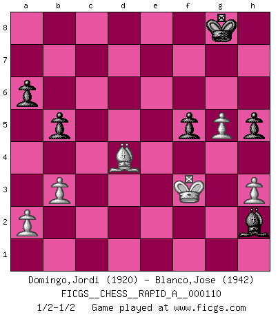 Last move : 1/2-1/2 2011 November 5 0:31:48 [Event "FICGS__CHESS__RAPID_A__000110"] [Site "FICGS"] [Date "2011.07.16"] [Round "1"] [White "Domingo,Jordi"] [Black "Blanco,Jose"] [Result "1/2-1/2"] [WhiteElo "1920"] [BlackElo "1942"] 1.e4 c5 2.Nf3 g6 3.d4 cxd4 4.Nxd4 Nc6 5.c4 Nf6 6.Nc3 d6 7.Be2 Nxd4 8.Qxd4 Bg7 9.Be3 O-O 10.Qd2 Be6 11.Rc1 Qa5 12.f3 Rfc8 13.b3 a6 14.Na4 Qxd2+ 15.Kxd2 Nd7 16.g4 f5 17.exf5 gxf5 18.h3 Rf8 19.f4 Rad8 20.Nc3 d5 21.cxd5 Bxd5 22.Nxd5 Nf6 23.Bb6 Rxd5+ 24.Ke3 Rd6 25.Bc7 Nd5+ 26.Kf3 Rd7 27.Bc4 b5 28.Bxd5+ Rxd5 29.Rhd1 Rxd1 30.Rxd1 Rc8 31.Rd8+ Rxd8 32.Bxd8 e6 33.Ke3 h6 34.Bb6 h5 35.g5 e5 36.fxe5 Bxe5 37.Bd4 Bh2 38.Kf3 1/2-1/2 Sicilian : Hungarian variation Kingside Castling by player Black (move 9) This chess game ended in a draw. Follow this game move after move (download)Chess is a beautiful mistress. (Bent Larsen) Man gibt nur Pakete auf. (Paul Keres) El poder defensivo de una pieza clavada, solamente es imaginario. (Aaron Nimzovich) RxDa4 pat (...) The difference between perseverance and obstinacy is that one comes from a strong will, and the other from a strong won't. (Henry Ward Beecher)