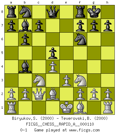 Last move : 0-1 2011 August 31 22:13:19 [Event "FICGS__CHESS__RAPID_A__000110"] [Site "FICGS"] [Date "2011.07.16"] [Round "1"] [White "Biryukov,Sergey"] [Black "Teverovski,Bogoljub"] [Result "0-1"] [WhiteElo "2000"] [BlackElo "2000"] 1.d4 Nf6 2.c4 e6 3.Nc3 Bb4 4.Qc2 O-O 5.e3 b6 6.Nf3 Bb7 7.Bd2 d5 8.cxd5 exd5 0-1 This chess game has been lost on time (started : 2011.07.16 8:47:59) Nimzo-Indian : Classical variation Kingside Castling by player Black (move 4) Player Black won this chess game. Follow this game move after move (download)The blunders are all there on the board, waiting to be made. (Savielly Tartakover) Intelligenz läßt sich nicht am Weg, sondern nur am Ergebnis feststellen. (Garry Kasparov) Una compensación adecuada por un sacrificio es tener una combinación sólida que conduce a una posición ganadora; una compensación adecuada por una metida de pata es dejar a tu oponente arrebatar una derrota de las fauces de la victoria. (Bruce A. Moon) Le profane ne songe pas à la somme de jouissance dont il se prive, qui méconnaît ce jeu aux ressources aussi variées que passionnantes. (Jean-Marie Jeanton-Lamarche) A belief is an idea the mind possesses, an idea that possesses the mind. (Robert Oxden Bolton)