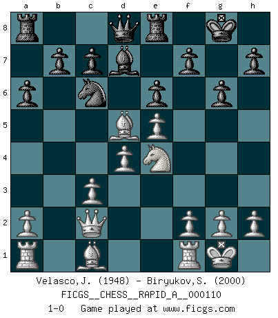 Last move : 1-0 2011 September 1 10:12:42 [Event "FICGS__CHESS__RAPID_A__000110"] [Site "FICGS"] [Date "2011.07.16"] [Round "1"] [White "Velasco,Jose Maria"] [Black "Biryukov,Sergey"] [Result "1-0"] [WhiteElo "1948"] [BlackElo "2000"] 1.d4 d5 2.c4 dxc4 3.Nf3 Nf6 4.e3 Nc6 5.Bxc4 e6 6.Nc3 Bb4 7.O-O Bxc3 8.bxc3 O-O 9.Qc2 Re8 10.e4 a6 11.e5 Nd5 12.Ng5 g6 13.Ne4 Bd7 14.Bxd5 1-0 This chess game has been lost on time (started : 2011.07.16 8:47:59) QGA, 4.e3 Kingside Castling by player White (move 7) Kingside Castling by player Black (move 8) Player White won this chess game. Follow this game move after move (download)Any material change in a position must come about by mate, a capture, or a Pawn promotion. (Purdy) Die Jungen erwarten, dass Opa einfach umfällt. Dann aber kann Opa fünf Stunden lang Schach spielen und die jungen Gegner an die Wand drücken. (Viktor Kortschnoi) Estaba muy claro de que el punto vulnerable del Gran Maestro Americano (Bobby Fischer) radicaba en las posiciones de doble filo, colgantes, irracionales, donde el siempre falló en encontrar un triunfo aún en una posición de clara victoria. (Efim Geller) Le temps de noter son nom sur la feuille de partie, j'étais déjà en zeitnot ! D'un modeste amateur apparié lors de la première ronde d'un open contre le grand-maître Azmaïparashvili. Without deviation from the norm, progress is not possible. (Frank Zappa)