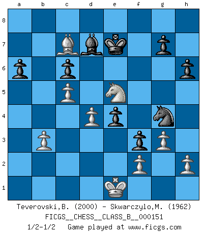 Last move : 1/2-1/2 2011 August 5 21:55:23 [Event "FICGS__CHESS__CLASS_B__000151"] [Site "FICGS"] [Date "2011.07.16"] [Round "1"] [White "Teverovski,Bogoljub"] [Black "Skwarczylo,Marek"] [Result "1/2-1/2"] [WhiteElo "2000"] [BlackElo "1962"] 1.d4 d5 2.c4 e6 3.Nf3 c6 4.e3 Nf6 5.Nc3 Nbd7 6.Bd3 a6 7.b3 Bb4 8.Bd2 Qe7 9.O-O O-O 10.Qe1 a5 11.a3 Bxa3 12.c5 Bb4 13.e4 Bxc3 14.Bxc3 dxe4 15.Bxe4 Nxe4 16.Qxe4 Nf6 17.Qc2 Nd5 18.Bxa5 Bd7 19.Ne5 Ra6 20.Nc4 Rfa8 21.Qb2 e5 22.Rfe1 e4 23.Bd2 f5 24.Rxa6 Rxa6 25.Ra1 f4 26.Rxa6 bxa6 27.Qc1 Qh4 28.Qe1 f3 29.Ne5 h6 30.Qd1 Nf6 31.g3 Qh3 32.Qf1 Qxf1+ 33.Kxf1 Kf8 34.Ke1 Ke7 35.Ba5 Ng4 36.Bc7 1/2-1/2 Queen's gambit declined Kingside Castling by player White (move 9) Kingside Castling by player Black (move 9) This chess game ended in a draw. Follow this game move after move (download)One of these modest little moves may be more embarrassing to your opponent than the biggest threat. (Siegbert Tarrasch) Der 70jährige Viktor Kortschnoi: Die Rentenanstalt wollte mich zwingen in Rente zu gehen. Meine Frau erhält jetzt eine Pension- und ich zahle weiter in die Rentenkasse ein! (Viktor Kortschnoi) Un sacrificio se refuta mucho mejor al aceptarlo. (Wilhelm Steinitz) Toute estimation doit être constamment réévaluée. (Jacob Estrin) God is an atheist. (Unknown)