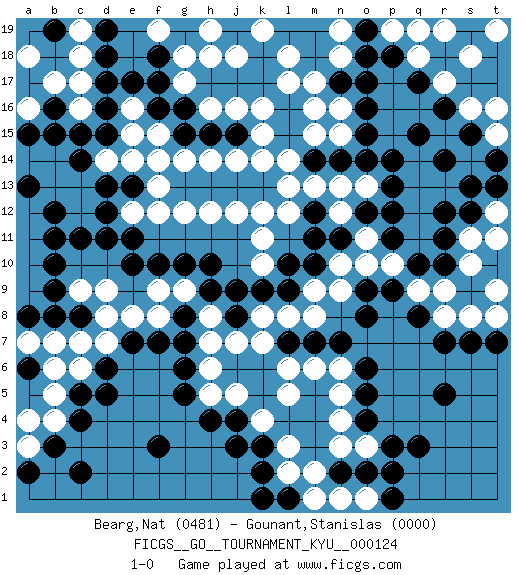 Last move : 1-0 2011 September 10 21:47:35 [Event "FICGS__GO__TOURNAMENT_KYU__000124"] [Site "FICGS"] [Date "2011.07.17"] [Round "1"] [Black "Bearg,Nat"] [White "Gounant,Stanislas"] [Result "1-0"] [Rating 1 "0481"] [Rating 2 "0000"] 1.q3 r17 2.c4 c16 3.k17 j16 4.r10 k15 5.c11 k10 6.j3 m17 7.k13 l12 8.j13 h12 9.h13 f13 10.g13 g12 11.f14 g14 12.e13 f12 13.g15 h14 14.l13 m13 15.m14 l14 16.l15 k14 17.m12 n13 18.n14 n12 19.m11 m15 20.l16 n15 21.o14 k12 22.h15 j14 23.j15 k16 24.j17 h16 25.g16 j12 26.n11 l17 27.o15 m16 28.o12 o13 29.p13 l13 30.h17 g17 31.f17 g18 32.f18 h18 33.k18 l18 34.g19 k19 35.l10 j18 36.o16 f15 37.f16 e14 38.e17 e16 39.d16 e15 40.d15 d14 41.c15 c17 42.d17 c18 43.d13 c13 44.d12 c12 45.c14 f14 46.e11 e12 47.d11 o11 48.p12 p10 49.p11 o10 50.o9 q9 51.q8 n10 52.m10 b13 53.b15 a14 54.b16 b17 55.a17 a18 56.b11 a16 57.a15 b14 58.b12 n9 59.o8 m9 60.l9 m8 61.m7 l8 62.k9 k8 63.j9 h8 64.j8 j7 65.h9 g9 66.g8 h7 67.g10 f9 68.f10 f8 69.g7 k7 70.h10 h6 71.f7 e8 72.e7 d8 73.c8 d7 74.d6 c7 75.b8 b7 76.a8 c9 77.b9 d9 78.g6 a7 79.b10 c6 80.d5 b5 81.c5 b4 82.b3 a3 83.a2 a4 84.a6 b6 85.c2 r9 86.s9 r8 87.r7 s8 88.s7 s10 89.q10 t9 90.p9 q11 91.r11 q12 92.r12 q13 93.p14 q14 94.q15 r13 95.s13 s11 96.s12 t11 97.t7 h19 98.d18 c19 99.b19 f19 100.a17 t8 101.r14 h5 102.g5 m6 103.n7 n6 104.o6 n5 105.o5 n4 106.o4 n3 107.o2 m2 108.j4 j5 109.h4 k4 110.l7 l6 111.k3 l3 112.k2 o3 113.p3 l2 114.k1 n1 115.p2 l5 116.d19 q18 117.q17 s18 118.r16 s16 119.s15 t15 120.t14 t16 121.p18 p19 122.o19 q19 123.o18 r19 124.r5 t12 125.t13 a16 126.a13 k11 127.e10 n18 128.n17 n16 129.o17 n19 130.f3 t19 131.n2 o1 132.p1 m1 133.l1 1-0 Here are the names of the openings (joseki) played in the four corners : Player Black won this Go (weiqi, baduk) game. Follow this game move after move (download)Against three in a row, play right in the center. (Anonymous) It is a good thing for an uneducated man to read books of quotations. (Winston Churchill)