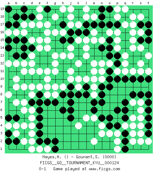 Last move : 0-1 2012 January 4 5:33:36 [Event "FICGS__GO__TOURNAMENT_KYU__000124"] [Site "FICGS"] [Date "2011.07.17"] [Round "1"] [Black "Hayes,Alexander"] [White "Gounant,Stanislas"] [Result "0-1"] [Rating 2 "0000"] 1.b18 q17 2.c19 d17 3.c18 e18 4.b17 c16 5.a17 b16 6.a19 a16 7.d18 e17 8.f19 e19 9.f18 f17 10.d16 g18 11.g19 h19 12.f19 d15 13.e16 f15 14.c15 e15 15.c14 f16 16.b15 d13 17.a15 c17 18.b13 c12 19.a14 b12 20.c13 a12 21.d14 e14 22.e13 d12 23.e12 e11 24.f12 g12 25.f11 f10 26.e10 d11 27.d10 g11 28.f13 g13 29.g10 f14 30.f9 f11 31.d9 g9 32.h10 h9 33.j9 j10 34.h11 j11 35.h12 j13 36.h8 g8 37.g7 f8 38.e8 e9 39.f7 f9 40.j12 k12 41.k11 h13 42.k10 k9 43.j8 l10 44.l11 m11 45.l12 l13 46.k14 m12 47.k8 d8 48.e7 c9 49.c10 b10 50.l9 k10 51.k13 l14 52.d7 c11 53.c8 d9 54.h6 k15 55.m10 m9 56.l8 n10 57.n8 m8 58.m7 c7 59.b8 b7 60.o9 a8 61.n9 m10 62.p10 d6 63.e6 d5 64.e5 d4 65.e4 d3 66.e3 d2 67.e2 e1 68.g2 f1 69.f2 d1 70.g1 p11 71.o11 o12 72.p12 q11 73.o13 n12 74.o10 q12 75.p13 q13 76.q10 r11 77.r10 p14 78.o14 p15 79.q14 r14 80.q15 r15 81.q16 p16 82.r16 s16 83.r13 r17 84.r12 s12 85.s13 t13 86.s10 s14 87.t10 n15 88.o15 o16 89.n14 m15 90.j15 j14 91.j16 j17 92.k16 k17 93.l16 m16 94.l17 l18 95.m17 m18 96.k18 j18 97.k19 l19 98.h17 h16 99.h15 g16 100.n17 l15 101.n18 j19 102.o17 p18 103.o19 p19 104.q18 r18 105.p17 q19 106.n19 s11 107.j6 t11 108.t17 s18 109.t16 b9 110.t15 b3 111.s17 n11 112.s15 r16 113.b2 c2 114.a3 a4 115.a2 b4 116.b5 c6 117.a5 c4 118.j7 r3 119.n7 s2 120.t3 s3 121.t4 s4 122.t5 s5 123.t6 s6 124.t7 s7 125.t8 t2 126.s8 r7 127.p6 q4 128.q5 o3 129.p4 p3 130.o4 n3 131.o5 r5 132.q6 m2 133.q2 p2 134.q3 r4 135.q1 r2 136.q7 p1 137.r8 n4 138.n5 m5 139.m6 l5 140.j5 k4 0-1 Here are the names of the openings (joseki) played in the four corners : Corner q16 : q17 l11 Komoku (Somok, Xiao~mu`) 3-4 Point. The komoku (3-4) point is the traditional corner enclosure move.. Corner q4 : l9 m9 This joseki is unknown. A weak or weird move has probably been played in this corner. Player White won this Go (weiqi, baduk) game. Follow this game move after move (download)Balance is not what players strike for, and if it does arise, it is in spite of them. (Pierre Audouard) Hardware: the parts of a computer that can be kicked. (Jeff Persis)